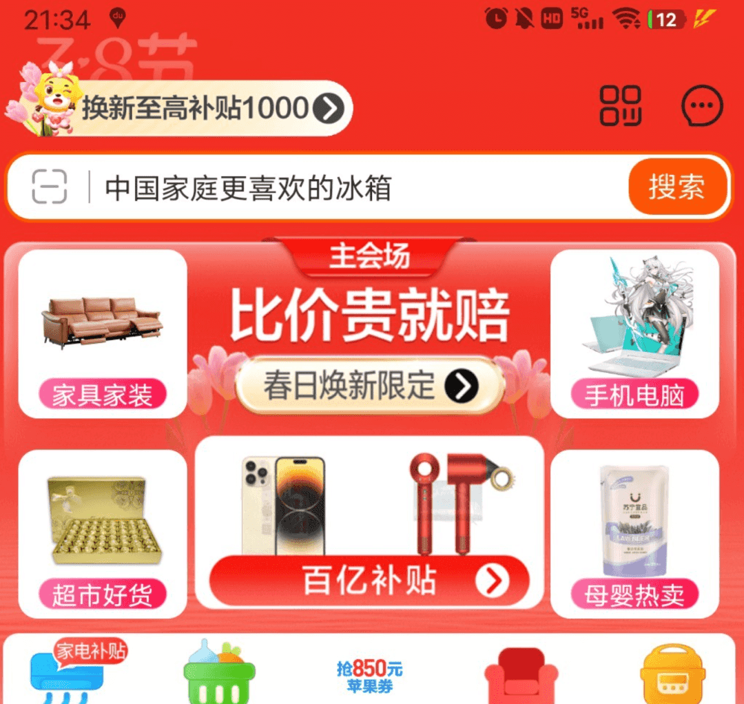 3月6日消息,苏宁易购App于今晚8点上线百亿补贴频道,苏宁易购App首页已经出现了百亿补贴频道入口。在苏宁易购App首页,百亿补贴频道与新品首发频道并列位于APP首页左下方,此外,首屏正中间也设有百亿补贴的入口。 进入百亿补贴频道后,首屏下方设置了“手机3·8焕新节”主会场、“百亿补贴”、“全部会场”、“手机电脑”、“家用电器”入口。“全部会场”页面中分布着精选推荐、厨卫电器、优选空调、手机电脑、家居家装等品类分类。“百亿补贴”上方标识有“大牌好货”、“官方补贴”、“全场包邮”。