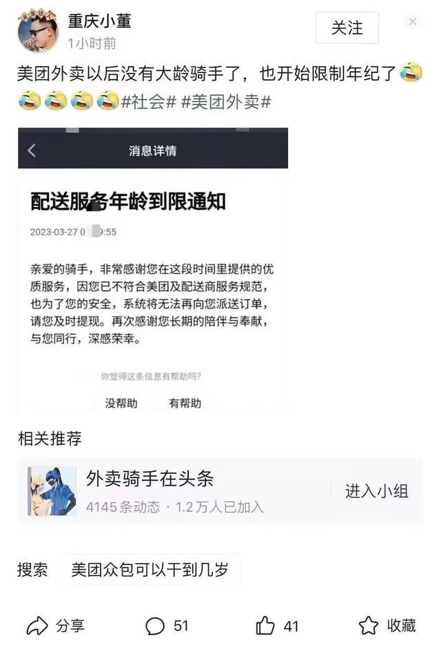 近日,有用户在社交媒体晒出收到的美团《配送服务年龄到限通知》,称“美团外卖以后没有大龄骑手了。” 该网友表示,是由于自己年龄太大才收到此份通知。网传《通知》显示:“因您已不符合美团及配送服务规范,也为了您的安全,系统将无法再向您派送订单,请您及时提现。” 3月28日,澎湃新闻记者了解到,美团确实对外卖骑手有年龄配送限制,为18周岁至57周岁。但据内部人士告诉记者,这并非近期出台的限制,而是长期有类似规定,主要出于对骑手的安全考虑。“以后年纪大想去送外卖都不行了。”在微博上,有网友调侃。 3月24日,美团(03690.HK)发布2022年第四季度及全年业绩,美团2022年营收2200亿元,同比增长23%。净亏损66.9亿元,同比缩窄71.6%,经调整后净利润28亿元。 去年第四季度,美团总营收601.3亿元,同比增长21.4%。净亏损10.8亿元,同比缩窄79.7%。调整后净利润为8.3亿元,连续两个月同比扭亏为盈。 数据显示,美团全年即时配送订单量同比增长14%至177亿单,其中餐饮外卖单日订单量峰值突破6000万单。用户与平台的黏性进一步加大,用户年均交易笔数达40.8笔,同比增长14%。 截至收盘,美团报收134.6港元,涨2.44%。