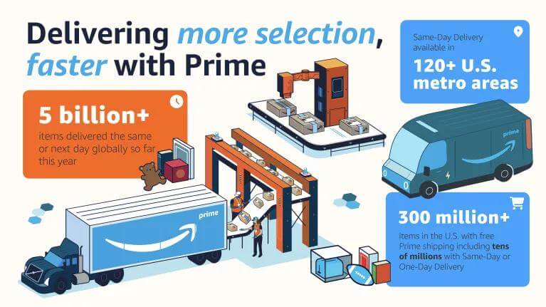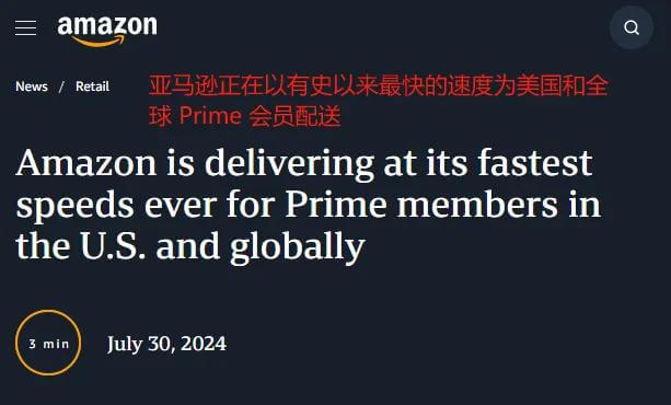 一、送货速度达到前所未有的纪录水平 亚马逊再度以切实之举印证,物流乃是捍卫其强大电商帝国之位的坚固防线。 亚马逊官方近期发布公告指出,自本年度伊始,亚马逊于全球范畴达成了有史以来最为迅疾的 Prime 配送速率,全球当日达或次日达的商品逾 50 亿件,同比增幅超 30%。此 50 亿件商品当中,多数系通过 FBA 予以配送,且有逾 60%的销售额源自第三方卖家。 亚马逊送货速度创新高 图源:Amazon Prime 配送速度再度实现突破并达到新的高度,其背后得益于平台多样化产品选择所提供的有力支撑。于美国而言,亚马逊为超过 3 亿件商品提供 Prime 免费配送服务,然而在 2005 年推出 Prime 会员服务之际,仅有 100 万件商品可享此服务。当下 Prime 所提供的产品选择数量为其首次推出之时的 20 倍,配送速度亦为首次推出之时的两倍。 多种产品可享受免费送货服务 图源:Amazon “要开展电商业务,物流需先行一步”,此言论早已成为业界的普遍共识。毕竟,送货速度愈快,消费者的满意度便愈高,进而其回购的可能性亦随之增大。如此紧密关联,将为平台持续注入源源不断的发展动力。 例如在刚刚落幕不久的 Prime 会员日里,全球消费者累计下单超过 2 亿件商品,再度刷新过往的销售纪录。而在 2023 年整年度,亚马逊于全球范围内实现当日达或次日达的商品数量超过 70 亿件,其中涵盖美国 40 多亿件以及欧洲 20 多亿件。 一次又一次于物流服务领域达成自我突破,恰如亚马逊商城全球首席执行官 Doug Herrington 此前所表述,“追求更迅速的配送时效乃亚马逊的长远目标,我们深知未来仍存有巨大的提升空间,亚马逊将会不懈努力,为顾客呈献更快捷的配送服务”。 二、长期投资布局 客观而言,亚马逊在物流领域能够达成现今的成就,实则投入了大量的人力、物力以及财力。 以 2022 年的那次物流变革为例,彼时其舍弃了美国全国性的中心辐射配送网络,转而将物流配送网络划分为 8 个区域,每个区域均存有被订购的商品,借由这种方式达成本土化运输。尤为关键的是,此举措不但降低了平台的物流成本,而且提升了配送速度。 分成8个配送区域 图源:Amazon 在对物流网络实施变革之际,亚马逊亦未曾忽视对物流网络的拓展,强化地区覆盖范围。据相关统计表明,仅在本年度,亚马逊于美国所租赁、购置以及宣告新购置的新仓库占地面积已然超出 1600 万平方英尺。通过对工业产地予以收购并对分销网络加以重组,以此提升包裹配送速率。 在欧洲市场,亚马逊同样在加快构建物流网络。亚马逊官方所发布的公告指出,当下亚马逊在欧洲已然成功构建了逾 80 个配送中心网络,负责处理从客户点击购买至商品交付期间的所有事务,持续为物流提速。 亚马逊在欧洲拥有超80个配送中心 图源:Amazon 凭借持续深入耕耘物流领域这一举措,物流已成为亚马逊的核心竞争力所在。据相关报道,当下亚马逊已然超越联合包裹(UPS)和联邦快递(FedEx),荣膺美国最大快递公司之位。并且在 2023 年全球货运企业 50 强榜单当中,亚马逊力挫诸多巨头,雄踞榜首。 “没有最快,只有更快”,亚马逊在物流领域的前行步伐仍不会停歇。可以预期的是,亚马逊未来的物流帝国将会持续扩张,这会为平台赋予更多发展优势,相信诸位第三方卖家亦能从中受益良多。