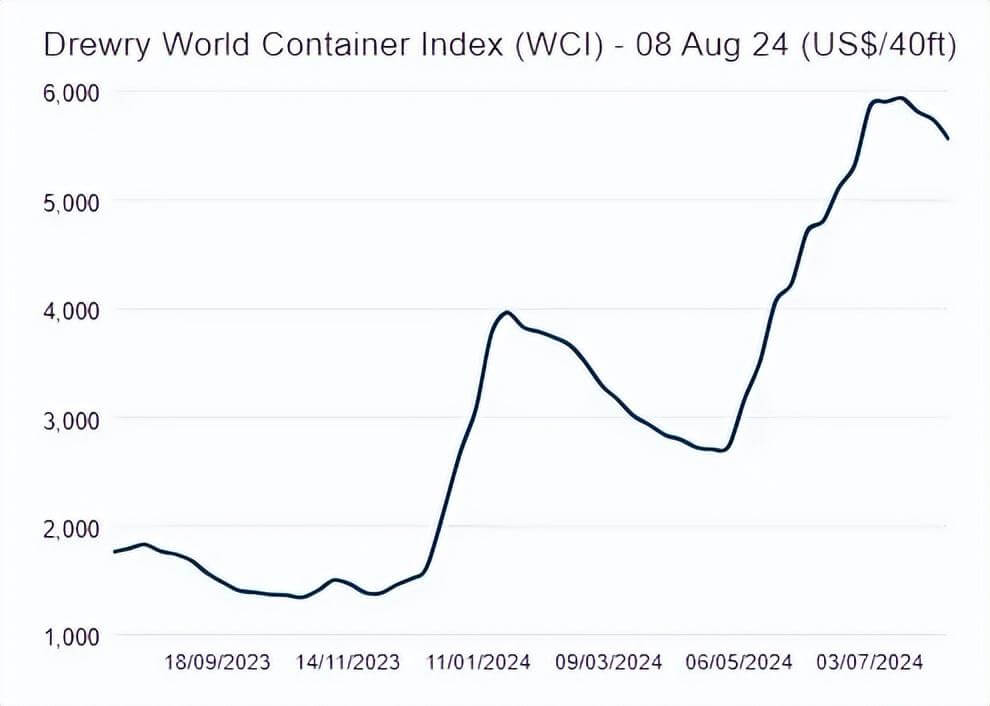 德鲁里 WCI 综合指数于本周下浮 3%,达每 40 尺柜 5551 美元,相较疫情期间的峰值降低 47%。