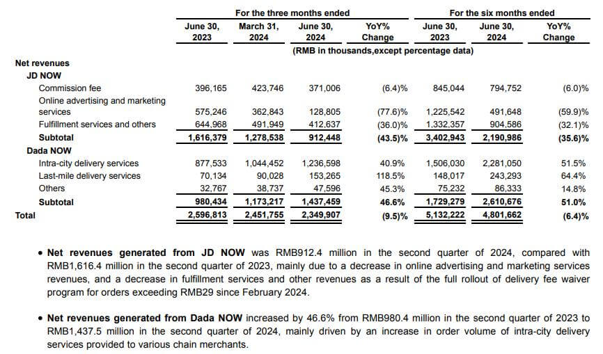 达达集团于 2024 年发布第二季度财报。在该季度,达达集团的营收达 23.499 亿元,与上年同期的 25.968 亿元相较,呈现下降态势。净亏损达 2.862 亿元,相较于上年同期的净亏损 1.587 亿元,亏损幅度有所扩大。若不依照美国通用会计准则,二季度净亏损为 1.423 亿元,而上年同期净利润为 840 万元,由盈转亏。 与此同时,达达集团宣布进行管理层调整。郭庆出任董事会董事兼薪酬委员会成员,并接替单甦担任董事会主席。此外,傅兵因个人原因辞去公司临时总裁一职,上述调整均自 2024 年 8 月 20 日起生效。郭庆自 2024 年 4 月起担任京东集团和达达集团顾问,更早之前为美团最高决策机构 S-team 成员。 图源:达达集团2024年第二季度财报 就业务细分而言,在第二季度,源自京东到家的净营收数额为 9.124 亿元,上年同期则为 16.164 亿元,呈现出显著的同比下降态势。此状况的主要成因在于自今年 2 月起全面施行超过 29 元订单的运费减免规划,致使在线广告与营销服务收入降低,同时履约服务及其他收入亦有所减少。源自达达快送(现已更名为“达达秒送”)的净营收为 14.375 亿元,上年同期为 9.804 亿元,同比增长达 46.6%,其主因是向各个连锁商家提供的市内快递服务的订单数量增加。 在第二季度,达达集团的总成本与支出为 26.670 亿元,同比呈下降趋势;运营和支持成本为 17.357 亿元,同比呈增长态势;销售和营销支出为 7.819 亿元,同比呈下降趋势;总务和行政支出为 4810 万元,同比呈下降趋势;研发支出为 8540 万元,同比呈下降趋势。 今年 8 月,达达快送正式更名为达达秒送。在商家渗透率持续提升的有力驱动下,达达秒送维持高速增长态势,上半年达成业务营收 26 亿元,同比增长 51%。上半年总体完单量达至 12.3 亿单,同比增长 15%,毛收入同比增长 15%至 55 亿元,市场份额得以进一步拓展。 图源:达达集团2024年第二季度财报 京东秒送于今年 5 月完成品牌整合升级之后,坚定不移地聚焦京东 APP 场域,从需求与供给两个方面持续施力,全方位优化用户体验,丰富平台供给能力。 在二季度,随着“秒送专区”于京东 APP 首页核心位置上线,剔除业务调整所带来的影响,京东 APP 场域的日均曝光用户同比增幅超过 70%,曝光转化率亦持续上扬,促使日均支付用户数量同比增长逾 110%。京东 APP 场域高频用户的同比增长速度超 110%,并且逐月加快。与此同时,针对京东 PLUS 会员,京东秒送推出了 PLUS 会员价等专属权益。今年 6 月,在京东秒送下单的日均 PLUS 用户数量相较 3 月增长 40%。 下单用户数量的增加、秒送心智的强化以及供给能力的提升,协同推动秒送线上订单量日峰值刷新纪录。二季度,京东 APP 场域线上订单量同比增长逾 100%。截至二季度末,京东秒送营业门店数量同比增长将近 70%。8 月,秒送专区的服务覆盖区域已拓展至全国。 图源:达达集团黑板报 在第二季度,京东秒送从五个重要方面持续强化供给能力。于门店覆盖层面,不断拓展并深入挖掘全品类,增进供给覆盖范围。以便利店为例,迄今,京东秒送已与美宜佳、罗森等品牌达成合作,其中美宜佳已上线超过 5,000 家门店。在 3C 数码领域,京东秒送与品胜等头部品牌携手合作,动销门店数量环比增加 10,000 余家,从而更优地满足用户对于急用数码产品的日常需求。 持续增强商品价格竞争优势。于秒送频道首页设立“一元大牌”专区,为用户供应逾千万款低至一元的优质商品;构建差异化的商品供给体系。秒送商超品类推出“镇店之宝”频道,精心筛选头部商超具备差异化优势的王牌单品。 在内容方面,持续提升商品展示的吸引力。5 月促使搜索点击率提升超过 1 个百分点,转化率提升超过 2 个百分点。在用户体验方面,持续优化履约体验。在第二季度,即时达专送订单的单均履约时长同比降低 15%。5 月于京东 APP 场域上线的准时保服务,倘若配送超时 10 分钟及以上,京东秒送将向用户自动赔付无门槛优惠券。