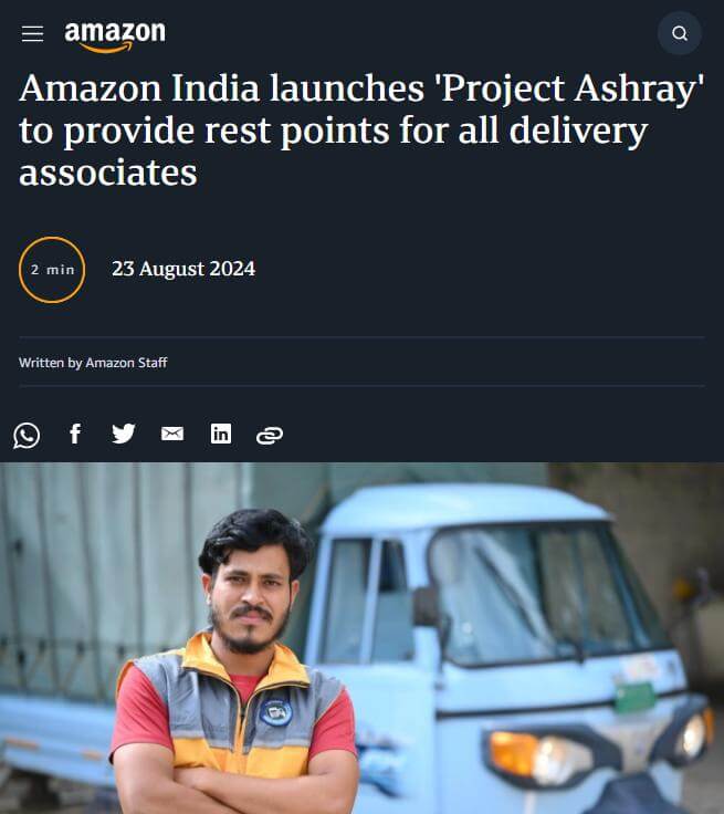 亚马逊印度与 Udyasa 基金会携手推出“Ashray”项目,旨在于印度主要城市为送货员构建休息点网络。当下,亚马逊拟定在德里首都区、班加罗尔以及孟买等人流量较大之处初步设立五个试点中心,整个电商生态系统内的送货员皆可使用 Ashray 中心。日前,国际劳工组织印度地区主任 Michiko Miyamoto 在古尔冈为印度首家 Ashray 中心举行了揭幕仪式。 图源:Amazon Newsroom Ashray 中心将予以提供洗手间、座位、饮用水以及充电站等基础设施。每个 Ashray 中心一次性可容纳 15 人,全年开放,开放时间为上午 9 点至晚上 9 点,设施使用免费,每次使用时长限制为 30 分钟,同时还将为送货员配备停车位。亚马逊将施行多项举措,增强送货员对这些休息点的认知,Ashray 中心的位置也将增添至 Google 地图中,以便送货员进行访问。 亚马逊印度公司或许会在未来数月内,依据 Ashray 项目开发更多的休息设施。此类设施将涵盖有专人守卫的卫生间,用以保障女性送货员的安全,在雨季或者热浪期间提供庇护之所,并提供饮用水、手机充电设施、急救支持以及以政府补贴价格提供的电动两轮车充电设施。 亚马逊印度运营副总裁 Abhinav Singh 指出:“于亚马逊而言,我们致力于维持行业领先的基础设施及实践,以保证我们的送货合作伙伴获取最优的道路体验。Ashray 项目乃是我们改善驾驶员体验和福祉的广泛努力当中的重要构成部分。通过提供配备基础设施的专用休息点,我们旨在确保整个电子商务生态系统内的所有送货员工,在工作之时均能够拥有尽可能最为优良、最为舒适的环境。”