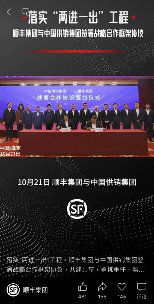 深圳顺丰泰森控股(集团)有限公司(以下简称“顺丰集团”)与中国供销集团有限公司(以下简称“中国供销集团”)于日前签署了战略合作框架协议。双方将不断拓展合作范畴,于冷链仓储物流、城乡货邮发展、快递进村以及农产品区域品牌塑造等方面,充分发挥各自的资源与渠道优势,共同构建物流新生态。 图源:顺丰集团官微 在签约仪式上,双方代表针对冷链仓储、绿色回收等议题进行了深入探讨与交流。双方一致认为,彼此资源匹配程度较高,秉持共同发展理念。未来,双方应统一方向、整合资源、明确产品定位,共同开拓可持续的合作之路,为乡村振兴贡献力量、增添光彩、赋予能量。 农村寄递物流作为农产品进城、工业品下乡的重要渠道之一,近年来,顺丰积极响应“两进一出”工程号召,深入探索“快递下乡”“快递进村”模式,持续完善“县、乡、村”三级物流配送体系。目前,已建成 10 万个乡村服务合作站点,提供超过 5 亿次互寄服务,以实际行动助力乡村全面振兴。在提供高质量服务的基础上,顺丰从产地溯源、包装研发、物流配送、产销对接等方面对农产品寄递不断进行革新与升级,以创新方案切实践行助农惠农。截至目前,顺丰已将“农产品流通服务网络”拓展至全国 2800 多个县区级城市,涵盖全国三级品类特色农产品 226 类,累计达 5500 多种。