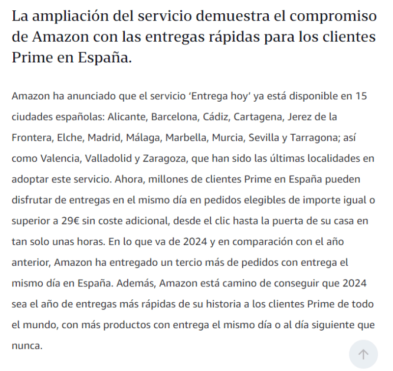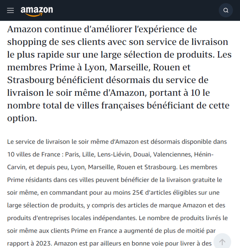 亚马逊宣布其当日送达服务已在西班牙15个城市和法国4个城市正式推出。现在,西班牙数百万Amazon Prime客户均可享受29欧元或以上合格订单的当日送达服务,无需额外费用,从点击下单到送货上门只需几个小时。2024年到目前为止,与上一年相比,亚马逊在西班牙的当日送达订单数量增加了三分之一。 图源:Amazon Newsroom 根据Ipsos Digital为亚马逊进行的一项研究,快速、免费的送货是70%的西班牙消费者最看重的服务之一。最受欢迎的当日送达商品包括不同类别的产品,包括日常必需品、亚马逊设备等。例如,马德里Prime顾客最需要的产品是Instax Mini Film胶片;巴塞罗那和萨拉戈萨的客户订购了Amazon Fire TV Stick;塞维利亚和瓦伦西亚的Dodot湿巾;来自马拉加的普莱瓦牛奶;还有穆尔西亚的瓦尔塔电池;在巴利亚多利德和阿利坎特,当日达订购最多的产品分别是Cecotec浓缩咖啡机和Platanitos Verdes零食。 同时,亚马逊还在法国扩大当日送达服务,新增里昂、马赛、鲁昂和斯特拉斯堡,使该服务覆盖的城市总数达到10个。此项目同样仅适用于Amazon Prime会员,允许客户在下单当天收到订单,而无需支付额外费用,只需订单总额达到25欧元以上。与2023年相比,当日送达服务的产品选择范围扩大了50%以上,包括从日常必需品到电子产品以及来自独立本地品牌的商品。 为了继续满足客户的需求,亚马逊最近宣布,从2019年到2024年底,将在整个欧洲的机器人、技术和人工智能领域投资超过7亿欧元。新技术支持员工履行职责,为员工提供更安全的工作环境以及提高技能的机会。与此同时,机器人技术和人工智能驱动的创新提高了客户的价格、选择和便利性,同时减少了包装材料。 图源:Amazon Newsroom