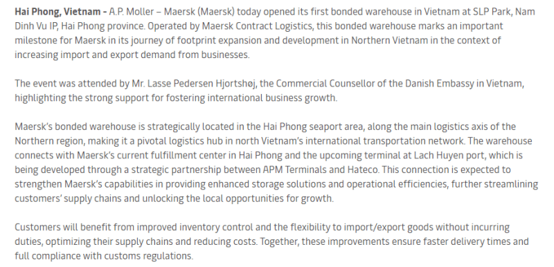 丹麦综合航运公司马士基宣布,在越南海防省南定武工业园区SLP园区设立了该公司在越南的首个保税仓库。这一举措旨在扩大其在越南北部的业务,并满足企业的进出口需求。 图源:马士基 新开设的保税仓库采用标准化设计,配备最新的货架系统、分类流程、库存管理和自动条形码系统。该设施还注重环保,通过最大程度地利用自然光、使用节能LED以及在办公室和公共场所安装运动传感器,成功减少了电力和能源消耗。 该仓库位于海防港区北部主要物流轴线的战略位置,与马士基海防的配送中心以及未来在叻县港的码头相连。连接交通网络的建设预计将提升马士基的仓库容积和运营效率,提高服务质量和成本控制,为客户的供应链提供优化,并为当地经济增长提供机遇。客户将受益于改进的库存控制和无需缴纳关税即可灵活地进出口货物,从而优化供应链并降低成本。这些改进共同确保了更快的交货时间并完全遵守海关规定。 亚马逊越南将成为该保税仓库的首个客户,从10月开始运营,并将与马士基现有合作伙伴SLP合作,进一步巩固业务合作关系。马士基合同物流将提供保税仓储服务、国内配送、海关手续和内陆运输服务。