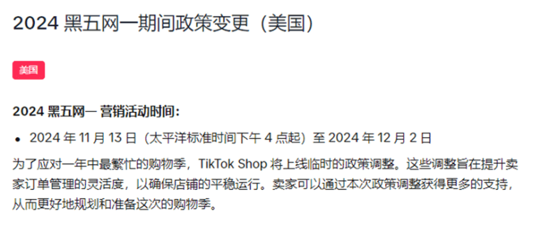 一、更新六大政策 随着全球经济逐渐复苏,消费者购买力日益增强,2024年假日购物季备受电商平台和卖家关注。 而社交电商巨头TikTok Shop也对本次旺季大促十分重视。据报道,近日,为了更好地迎接2024年黑五网一购物季,TikTok Shop美国站点宣布将针对六大物流政策做出临时调整,旨在提升卖家旺季订单管理的灵活度。 TikTok Shop美国站调整旺季政策 图源:TikTok Shop Academy 首先,TikTok Shop美国站将在北京时间2024年11月14日至2024年12月3日期间延长标准订单履约时效,卖家发货时间从3个工作日增至4个工作日,自动关单期限也从订单日起的7个工作日延长至8个工作日。此外,考虑到旺季期间卖家工作量暴涨,TikTok Shop还贴心的延迟了履约率时效更新,只要卖家能提供有效物流追踪号即可避免延迟发货处罚。 其次,TikTok Shop还延长了旺季订单退货期限,除了珠宝、电子产品等需要遵循30天退货窗口规定的产品,其余在指定日期内购买的商品都可以在2025年2月10日申请退回。与之相对应的,退货订单在途时间窗口和退货退款审核窗口也会往后延,以给予卖家更多时间处理售后问题。 TikTok Shop美国站退货期延长 图源:TikTok Shop Academy 最后,TikTok Shop还提醒各位备战美国大促的卖家,目前商家中心已经推出了退货和退款自动化功能,卖家大可以使用这些功能提高自己的售后处理效率,为消费者提供更快捷的购物体验。 二、决战旺季大促 事实上,年底旺季大促包含黑五、网一、圣诞等多个重要节点,向来是卖家争夺市场份额的关键时机。 根据贝恩此前发布的研究报告,预计今年黑五网一大促活动期间,美国市场的零售额将同比增长5%,整体销售金额有望突破750亿美元大关。而美国在线交易和折扣信息分享平台Slickdeals的一项调查则显示,七成美国消费者已经计划在今年黑五和网一促销活动期间购物。 七成美国人计划参与黑五网一促销活动 图源:Slickdeals 当然,持续释放积极信号的美国旺季市场吸引了大批逐利的掘金者,除了TikTok Shop,一些卖家耳熟能详的电商巨头也参与其中。并且,为了保证卖家能顺利跟上大促步伐,这些巨头都各显神通,推出了一系列支持举措。 就拿全球电商巨头亚马逊来说,在官宣黑五网一假日大促的同时,亚马逊还承诺为卖家提供从9月到12月、从选品、物流、运营到节后复盘的全时段、全流程备战清单;无独有偶,美国零售巨头沃尔玛此前也上线了沃尔玛旺季智库,提供广告、选品、物流等方面的指导教学,旨在一站式打好旺季筹备基础。 沃尔玛旺季智库 图源:沃尔玛 总而言之,美国旺季市场机遇涌现,抢单大战一触即发,而为了确保卖家万无一失,电商平台的相关支持政策也是此起彼伏。卖家应充分利用这些资源,提前做好准备,抓住市场机遇,实现销售增长。