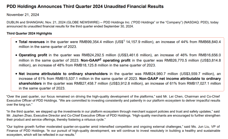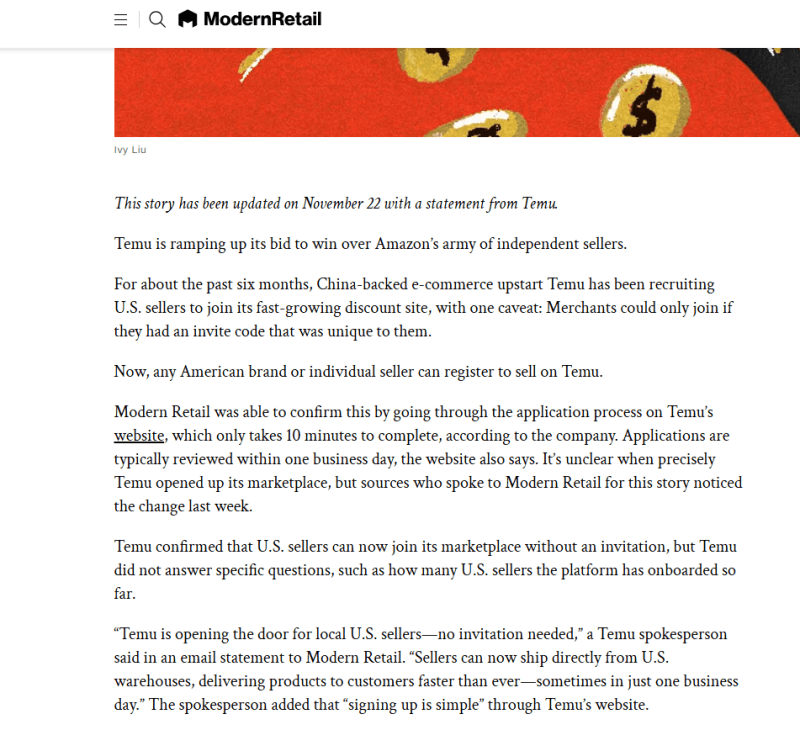 TEMU向所有美国卖家开放。 此前,TEMU一直在招募美国卖家加入其快速增长的折扣网站,但有一个条件:商家只有拥有独特的邀请码才能加入。现在,任何美国品牌或个人卖家都可以注册在TEMU上销售。 图源:Modern Retail TEMU发言人在给Modern Retail的电子邮件声明中表示:“TEMU正在为美国本地卖家打开大门—无需邀请。卖家现在可以直接从美国仓库发货,以前所未有的速度将产品送到客户手中—有时只需一个工作日。”发言人补充说,通过TEMU网站“注册很简单”。 据悉,TEMU的注册流程仅需10分钟即可完成,申请通常会在一个工作日内审核完毕。创建帐户后,申请表会要求用户填写业务信息,具体信息取决于业务类型。例如,如果以公司身份注册,申请表会要求填写雇主识别号。然后,申请表会要求填写卖家个人信息,例如地址和公民身份信息,包括个人身份证或护照号码。申请表要求卖家提供商店名称和徽标。最后,申请表要求提供地址证明,例如水费或电费单。之后,申请人只需点击“提交”。 值得一提的是,拼多多控股(TEMU所有者)于近日发布了第三季度财报。财报显示,拼多多三季度营收993.5亿元,同比增长44%;营运利润为242.9亿元,同比增长46%;非美国通用会计准则下营运利润为267.7亿元,同比增长48%;归母净利润为249.8亿元,同比增长61%;非美国通用会计准则下归母净利润为274.6亿元,同比增长61%。 图源:拼多多2024年第三季度财报