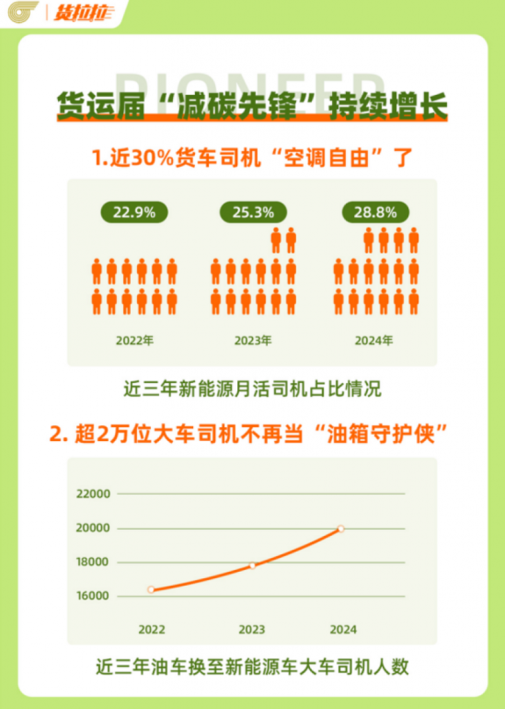 中国交通运输协会城市交通分会联合货拉拉发布《数说绿色货运·2024城市货运减碳数据报告》。 报告显示,从去年十月到今年十月,货拉拉平台40%的订单由新能源货车完成,新能源货车跑过的里程达74亿公里,加起来可绕地球赤道18.5万圈,相比用油车运输减碳142万吨,相当于7887万棵树一年的二氧化碳吸收量。 各大城市在“减碳”上也开始“使劲”,海南文昌新能源货车的完单占比高达95.8%,浙江金华新能源货车数量增长超2倍。此外,货拉拉“绿途行动”合作建设新能源电站8.6万座,94万个新能源充电桩,覆盖338个城市,充电量达9亿千瓦,累计为司机节省加油、充电成本超2亿元。 图源:中国网科技 2015年,货拉拉平台出现了第一位新能源货车司机。近三年,货拉拉平台新能源月活司机逐年增长,由22.9%上涨至28.8%,这也意味着,将近30%的货车司机不再为夏天开空调耗油而苦恼,实现了“空调自由”。 图源:中国网科技 除此之外,大车司机里的“减碳先锋”也在不断发展壮大,超2万位大车司机过去一年里将油车换至新能源车,摆脱了跑长途时睡在油箱下的困境。部分货车司机在将油车换至新能源车后,实现了降本增效。比如货车司机张师傅2022年换车后至今累计节约跑车成本超8万元。 随着新能源货车的普及,货运“低碳脚印”也逐渐遍布大江南北。《报告》显示,新能源货车司机注册的最东城市为黑龙江佳木斯市,最南城市为海南三亚市,最西城市为新疆喀什市,最北城市为黑龙江黑河市。从南到北,从东到西,都可以看见新能源货车司机注册的踪迹。 流动的新能源货车也让互联网货运“绿色”发展的底色更加鲜明。近一年,货拉拉平台出现的最远完单距离为3809公里,来自武汉的王师傅将装修建材从江西赣州运往新疆乌鲁木齐,历时八天,相比用油车运输减少碳排放1014千克。