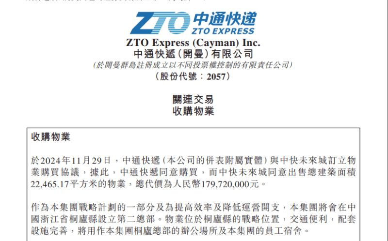 中通快递近日与中快未来城订立物业购买协议,据此,中通快递同意购买,而中快未来城同意出售总建筑面积22,465.17平方米的物业,总代价为人民币179,720,000元。 中通表示,作为集团战略计划的一部分及为提高效率及降低运营开支,集团将会在中国浙江省桐庐县设立第二总部。物业位于桐庐县的战略位置,交通便利,配套设施完善,将用作集团桐庐总部的办公场所及集团的员工宿舍。 图源:东方财富网 由于截至公告日期,中快未来城由赖梅松(中通快递执行董事兼控股股东)持有约57%权益,故中快未来城为赖梅松的联系人,因此为中通快递公司的关连人士。因此,根据《香港上市规则》第十四A章,订立物业购买协议及其项下拟进行的交易构成关连交易。 将收购的物业包括蓝城1号楼13楼至19楼,总建筑面积为1.41万平方米,及11号楼13楼至17楼,总建筑面积为8327.55平方米,位于浙江省杭州市桐庐县富春未来城城南街道通达大道586号。