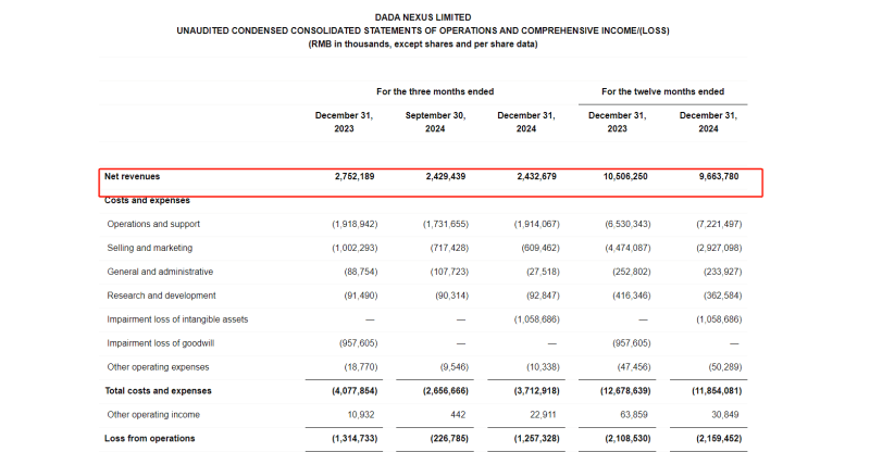 数据显示,达达集团2024年Q4营收24.33亿元,净亏12.27亿元,营业亏损为12.57亿元。2024年全年收入96.64亿元,增速下降8%;净亏损为20.385亿元;非公认会计准则净亏损4.26亿元,亏损进一步加大。 图源:达达集团官网 达达集团主要收入来自京东秒送和达达秒送。2024财年,达达秒送净收入58.05亿元,较上一年度增长44.6%;京东秒送净收入为38.59亿元,同比降幅达40.6%。达达集团表示,业绩下滑主要源于在线广告和营销服务收入减少以及配送服务和其他收入下降。 值得一提的是,2025年1月,京东向达达集团发出初步非约束性提议函,计划以每股2.0美元现金收购达达集团所有已发行普通股,较提案日前最近一个交易日收盘价溢价约42%。若提案通过,达达集团将私有化并退出公开市场。