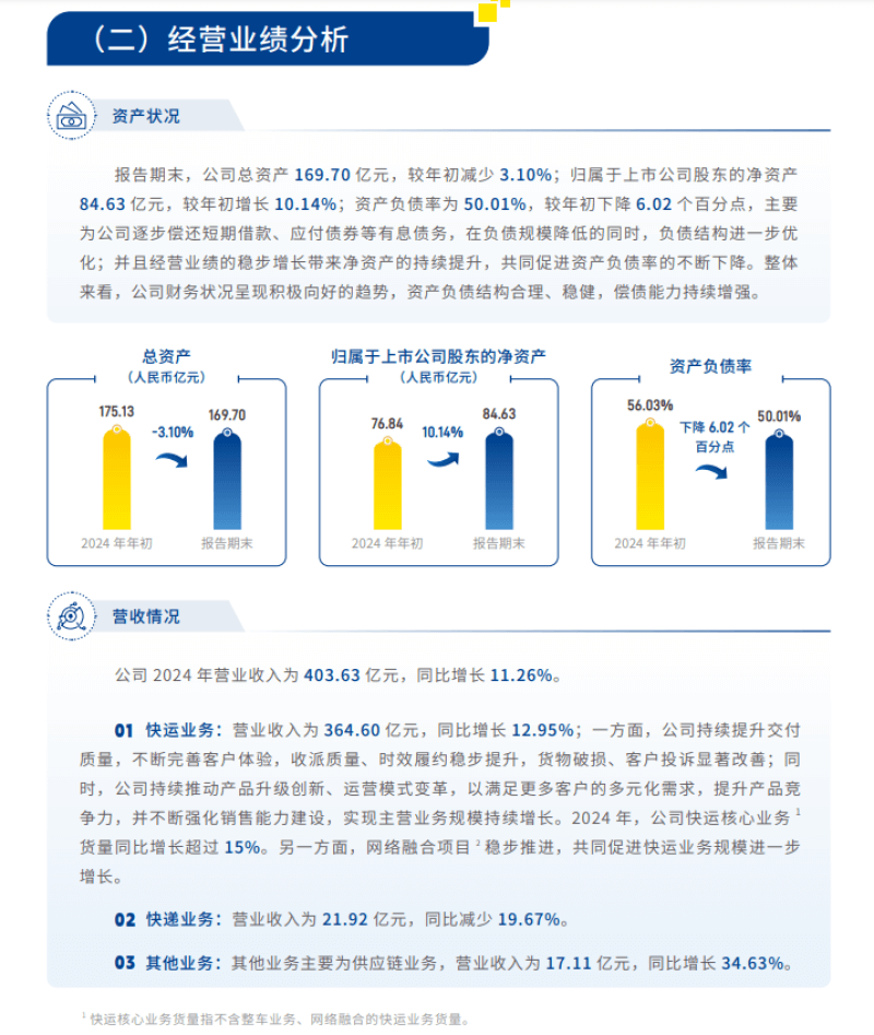 德邦股份公布2024年全年业绩报告。财报显示,德邦2024年营业收入403.63亿元,同比增长11.26%;归母净利润达8.61亿元,同比上涨15.41%,净利率持续攀升,展现出较强的发展韧性与潜力;扣非归母净利润为6.37亿元,同比增长12.2%。 报告期末,公司总资产169.70亿元,较年初减少3.10%;归属于上市公司股东的净资产84.63亿元,较年初增长10.14%;资产负债率为50.01%,较年初下降6.02个百分点。 图源:德邦股份2024年全年业绩报告 分业务来看,快运业务是公司的核心业务。2024年,快运业务营业收入为364.60亿元,同比增长12.95%;快递业务营业收入为21.92亿元,同比减少19.67%;其他业务主要为供应链业务,营业收入为17.11亿元,同比增长34.63%。其中,快运业务收入占比为90.33%,快递业务收入占比为5.43%,其他业务收入占比为4.24%。 2024年,公司一方面持续提升交付质量,不断完善客户体验,收派质量、时效履约稳步提升,货物破损、客户投诉显著改善;同时,公司持续推动产品升级创新、运营模式变革,以满足更多客户的多元化需求,提升产品竞争力,并不断强化销售能力建设,实现主营业务规模持续增长。公司快运核心业务货量同比增长超过15%。另一方面,网络融合项目稳步推进,共同促进快运业务规模进一步增长。 此外,公司不断夯实底盘建设,持续提升交付质量。2024年主营业务破损率同比下降37.1%,妥投率同比提升4.6个百分点,上楼投诉率同比下降77.5%。随着交付质量的持续提升,客户投诉率稳步下降,公司客户万票有责投诉率同比下降38.6%。成本及费用方面,持续性的精细化管理与资源合理管控也助推了降本增效。2024年,公司期间费用为22.19亿元,同比减少7.01%;管理费用为12.41亿元,同比减少20.4%。 同日,德邦物流还公告称,公司计划使用自有资金以集中竞价交易方式回购部分股份,回购金额不低于7500万元且不超过1.5亿元,回购价格不超过16.00元/股。回购的股份将全部用于注销并减少公司注册资本。 图源:德邦股份2024年全年业绩报告