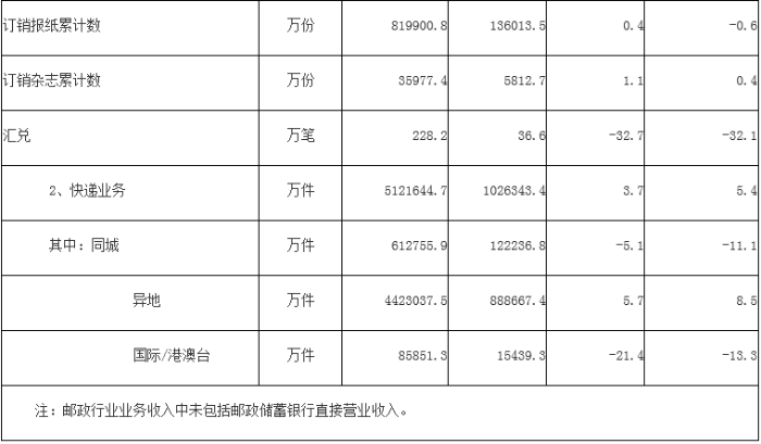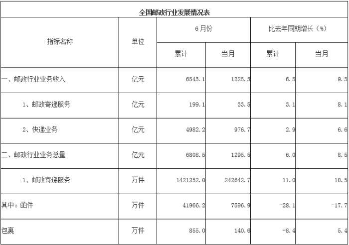 沙巴体育安卓版下载物流了解到,上半年,邮政行业业务收入(不包括邮政储蓄银行直接营业收入)累计完成6543.1亿元,同比增长6.5%;业务总量累计完成6808.5亿元,同比增长6.0%。 6月份,全行业业务收入完成1225.3亿元,同比增长9.3%;业务总量完成1295.5亿元,同比增长8.5%。 上半年,邮政服务业务总量累计完成1151.6亿元,同比增长6.6%;邮政寄递服务业务量累计完成142.1亿件,同比增长11.0%;邮政寄递服务业务收入累计完成199.1亿元,同比增长3.1%。 6月份,邮政服务业务总量完成179.9亿元,同比增长7.2%;邮政寄递服务业务量完成24.3亿件,同比增长10.5%;邮政寄递服务业务收入完成33.5亿元,同比增长8.1%。 上半年,邮政函件业务累计完成4.2亿件,同比下降28.1%;包裹业务累计完成855.0万件,同比下降8.4%;报纸业务累计完成82.0亿份,同比增长0.4%;杂志业务累计完成3.6亿份,同比增长1.1%;汇兑业务累计完成228.2万笔,同比下降32.7%。 上半年,全国快递服务企业业务量累计完成512.2亿件,同比增长3.7%;业务收入累计完成4982.2亿元,同比增长2.9%。其中,同城业务量累计完成61.3亿件,同比下降5.1%;异地业务量累计完成442.3亿件,同比增长5.7%;国际/港澳台业务量累计完成8.6亿件,同比下降21.4%。 6月份,全国快递服务企业业务量完成102.6亿件,同比增长5.4%;业务收入完成976.7亿元,同比增长6.6%。 上半年,同城、异地、国际/港澳台快递业务量分别占全部快递业务量的12.0%、86.3%和1.7%;业务收入分别占全部快递业务收入的6.6%、49.1%和10.9%。与去年同期相比,同城快递业务量的比重下降1.1个百分点,异地快递业务量的比重上升1.6个百分点,国际/港澳台业务量的比重下降0.5个百分点。 上半年,东、中、西部地区快递业务量比重分别为77.2%、15.3%和7.5%,业务收入比重分别为77.4%、13.3%和9.3%。与去年同期相比,东部地区快递业务量比重下降1.4个百分点,快递业务收入比重下降1.1个百分点;中部地区快递业务量比重上升1.1个百分点,快递业务收入比重上升0.6个百分点;西部地区快递业务量比重上升0.3个百分点,快递业务收入比重上升0.5个百分点。 上半年,快递与包裹服务品牌集中度指数CR8为84.7,较1-5月上升了0.1。 附 件 分省快递服务企业业务量和业务收入情况表 单位 快递业务量累计 同比增长 快递业务收入累计 同比增长 全国 5121644.7 3.7 49821950.1 2.9 北京 92131.8 -14.7 1419126.2 -7.7 天津 55343.3 -2.9 642097.2 -2.6 河北 239706.3 11.9 1817649.5 1.3 山西 29860.6 -13.2 360539.8 -13.7 内蒙古 12316.1 6.5 254734.5 5.4 辽宁 77204.9 0.1 796336.7 -1.3 吉林 23634.4 -11.5 300647.5 -12.4 黑龙江 32313.0 27.2 417958.6 15.9 上海 118206.5 -35.2 8682968.7 9.3 江苏 393967.1 -0.7 3741418.8 -1.3 浙江 1051271.1 0.4 5669221.2 -0.7 安徽 156190.9 13.7 1087642.2 10.0 福建 192492.8 -7.6 1667811.5 -4.2 江西 81167.5 14.7 752371.9 13.1 山东 274785.7 7.8 2164379.3 2.6 河南 211161.2 6.7 1579542.5 4.9 湖北 148462.0 20.2 1292370.3 13.8 湖南 103024.4 21.4 828253.9 11.6 广东 1449943.9 9.2 11822148.1 0.6 广西 47544.1 -2.7 547798.8 3.2 海南 8770.6 16.3 161656.3 6.6 重庆 50868.4 14.3 539116.1 7.8 四川 134482.1 7.6 1336645.6 8.0 贵州 21438.9 26.8 342036.9 14.8 云南 40326.3 5.2 456058.4 9.0 西藏 756.2 19.7 26766.8 26.4 陕西 47972.6 -3.6 578195.2 3.4 甘肃 9623.3 23.9 197347.9 16.0 青海 1617.1 2.2 45899.6 0.8 宁夏 4933.9 9.4 77979.5 6.7 新疆 10127.9 44.9 215230.8 26.2 快递业务量前50位城市情况表 排名 城市 快递业务量累计 排名 城市 快递业务量累计 1 金华(义乌)市 536212.9 26 重庆市 50868.4 2 广州市 510644.6 27 无锡市 43967.7 3 深圳市 266079.3 28 南通市 43839.2 4 揭阳市 184984.1 29 南京市 42726.9 5 杭州市 158231.5 30 绍兴市 41253.5 6 东莞市 133065.0 31 中山市 39329.8 7 汕头市 121535.4 32 青岛市 37427.1 8 上海市 118206.5 33 廊坊市 35438.7 9 苏州市 109379.8 34 沈阳市 35326.7 10 泉州市 93656.1 35 济南市 34252.0 11 北京市 92131.8 36 西安市 34180.3 12 武汉市 86857.9 37 潮州市 32929.1 13 成都市 85091.7 38 宿迁市 30598.6 14 郑州市 77392.4 39 南昌市 29516.5 15 温州市 75654.4 40 商丘市 27390.1 16 佛山市 74114.2 41 福州市 26702.8 17 宁波市 73801.1 42 厦门市 26463.3 18 临沂市 71092.6 43 湖州市 26372.9 19 台州市 69166.4 44 惠州市 26022.9 20 石家庄市 67502.8 45 昆明市 25500.1 21 长沙市 60648.7 46 邢台市 25381.8 22 合肥市 58972.6 47 潍坊市 24406.5 23 保定市 56065.7 48 南宁市 23637.1 24 天津市 55343.3 49 徐州市 23581.7 25 嘉兴市 55337.9 50 哈尔滨市 22378.8 快递业务收入前50位城市情况表 排名 城市 快递业务收入累计 排名 城市 快递业务收入累计 1 上海市 8682968.7 26 青岛市 424491.0 2 广州市 4042312.8 27 西安市 402098.2 3 深圳市 2783080.6 28 厦门市 376342.6 4 金华(义乌)市 1625580.4 29 济南市 373879.4 5 杭州市 1559915.5 30 台州市 364081.2 6 北京市 1419126.2 31 南通市 358905.8 7 东莞市 1372287.1 32 沈阳市 350250.6 8 苏州市 1099701.4 33 南昌市 339256.3 9 佛山市 836593.7 34 福州市 338340.3 10 揭阳市 818719.0 35 保定市 334516.7 11 成都市 795590.6 36 中山市 328742.7 12 武汉市 776015.7 37 临沂市 324822.8 13 郑州市 668908.7 38 廊坊市 323750.3 14 宁波市 657373.2 39 常州市 275727.3 15 天津市 642097.2 40 南宁市 274350.0 16 汕头市 589216.4 41 哈尔滨市 268345.4 17 泉州市 578582.3 42 惠州市 252875.5 18 重庆市 539116.1 43 昆明市 245506.8 19 无锡市 493166.5 44 绍兴市 232912.8 20 温州市 468289.5 45 长春市 192683.9 21 嘉兴市 466699.5 46 大连市 187717.3 22 长沙市 451943.9 47 徐州市 183754.6 23 合肥市 438831.3 48 宿迁市 181529.7 24 石家庄市 432397.4 49 湖州