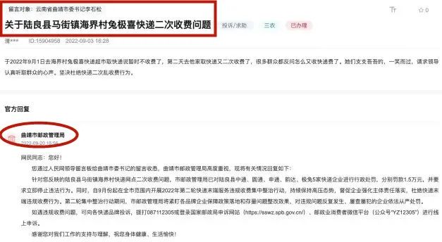 人民网“领导留言板”显示,9月20日,对于网民提出的“陆良县马街镇海界村快递网点二次收费问题”,云南省曲靖市邮政管理局回复称,市邮政管理局已对陆良县中通、圆通、申通、韵达、极兔5家快递企业进行行政处罚,分别罚款1.5万元,并要求立即停止违法行为。 网民在投诉中提到,其于9月1日到海界村兔喜快递超市取快递,当时工作人员说暂时不收费;次日,其去同一地点取快递时,被要求二次支付快递费。 对此,曲靖市邮政管理局回复称,市邮政管理局已对陆良县中通、圆通、申通、韵达、极兔5家快递企业进行行政处罚,分别罚款1.5万元,并要求立即停止违法行为。同时,自9月份起在全市范围内开展2022年第二轮快递末端服务违规收费集中整治行动,持续保持高压态势,督促企业强化主体责任落实,杜绝快递末端违规收费行为。第二轮集中整治行动期间,市邮政管理局将紧盯各品牌企业保障政策落地和存量问题整改效果,对违规问题反复发生、屡查屡犯的企业依法从严处罚。 在一则网民反映的“宣威市东山镇快递违规收费问题”的回复中,曲靖市邮政管理局还提到,2022年4月至6月,按照云南省邮政管理局统一部署,市邮政管理局在全市范围内开展快递末端服务违规收费集中整治行动。对宣威市中通、申通、圆通、韵达、极兔等品牌快递企业在乡镇农村地区违规收费行为下发了责令改正通知书,要求停止违法行为。 除上述来自曲靖市网民的投诉外,8月31日,玉溪市网民曾反映新平县漠沙镇也存在二次收取快递费的问题。对此,玉溪市邮政管理局回复到,经核查,目前新平县漠沙镇无备案的快递分支机构或末端网点。为此,玉溪市邮政管理局执法人员已于近期到新平县漠沙镇实地调查,并对该乡镇申通、中通、圆通、极兔等网点取证,后续将结合调查取证情况进行查处。 目前,漠沙镇申通、中通、圆通、极兔等网点已未向用户收取相关费用。下一步,玉溪市邮政管理局将按照《云南省邮政管理局关于开展快递末端服务违规收费2022年第二轮集中整治行动的通知》要求,在全市范围内开展2022年第二轮快递末端服务违规收费集中整治行动,要求各企业落实主体责任,严禁收费行为,落实末端派费政策,整合末端网络资源,降低派送成本。 同时,对企业存在的违法行为,发现一起查处一起,并因地制宜推动邮政、快递、交通、供销、商务等各类资源整合,加快推进玉溪市“快递进村”和县乡村三级物流体系建设,不断提升农村地区寄递服务水平。