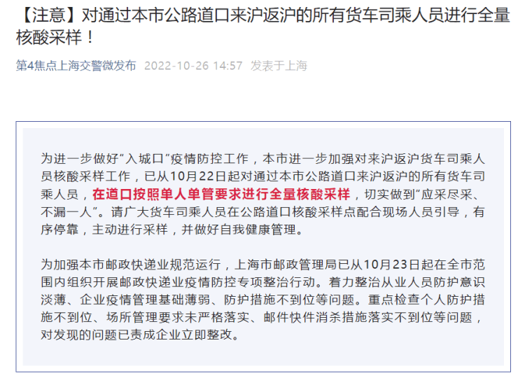 10月26日,上海市公安局交警总队发布公告称,为进一步做好“入城口”疫情防控工作,本市进一步加强对来沪返沪货车司乘人员核酸采样工作,已从10月22日起对通过本市公路道口来沪返沪的所有货车司乘人员,在道口按照单人单管要求进行全量核酸采样,切实做到“应采尽采、不漏一人”。 交警总队提醒广大货车司乘人员,在公路道口核酸采样点配合现场人员引导,有序停靠,主动进行采样,并做好自我健康管理。 另外,为加强本市邮政快递业规范运行,上海市邮政管理局已从10月23日起在全市范围内组织开展邮政快递业疫情防控专项整治行动。着力整治从业人员防护意识淡薄、企业疫情管理基础薄弱、防护措施不到位等问题。重点检查个人防护措施不到位、场所管理要求未严格落实、邮件快件消杀措施落实不到位等问题,对发现的问题已责成企业立即整改。