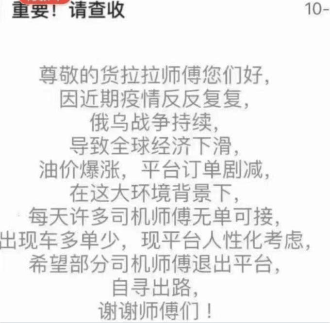 这两天,一个爆炸性的消息在卡友圈中传开。据传,货拉拉劝司机退出平台,自求生路。从网传的图片来看,内容只有短短的几句话—— “尊敬的货拉拉师傅您们好,因近期疫情反反复复,俄乌战争持续,导致全球经济下滑,油价爆涨,平台订单剧减,在这大环境背景下,每天许多司机师傅无单可接,出现车多单少,现平台人性化考虑,希望部分司机师傅退出平台,自寻出路,谢谢师傅们!” 后经过卡车之家从多方求证,该消息为假消息。 ● 卡友反应强烈 背后透露行业艰难 许多卡友看到这个图片内容以后不认为是真的,尽管最后也已经证实这一消息为假消息,但对于这一信息,大家反应还是比较强烈。 有人认为“必须要卸载货运平台”“运价都是平台搞低的”,有人觉得“刚买车的要哭死”,但也有人认为这是“市场竞争的结果”。当然,还有部分卡友比较冷静,认为平台劝退是正常的,毕竟“一锅饭只够10个人吃,但偏偏有100个人眼瞅着”。 不管如何,从大家的留言来看,每一条背后无不透露出货运行业的艰难。 对此,物流车队也有话说。有车队相关负责人表示:“尽管车队有合同物流,但现在货量少,行情差,许多散户撬单,导致我们的运价虽有合同,但有些时候也不得不调整让利。平台在发展时期让司机疯狂注册,这种野蛮的发展方式,终究会影响整个货运行业的健康发展。” ● 维稳运价 货运平台更要转型促行业发展 对于平台来说,货运行业发展如此艰难,平台究竟起到多少负面作用?特别是运价走到如今这低水平,平台为什么不能做到维稳? 此前,交通运输新业态协同监管部际联席会议办公室已经对满帮集团、货拉拉、滴滴货运、快狗打车4家互联网道路货运平台公司进行了约谈。 约谈要求:一要进一步提高政治站位,深入排查整治各平台公司存在的安全风险隐患,及时化解风险,确保行业安全稳定;二要健全货源审核制度,完善拖欠运费处理协调机制,不得恶意压价竞争。2022年年底前,不得随意调整收费标准和运营规则,要保持运输价格的相对稳定,确保货车司机享受通行费减免的政策红利;三要加大对货车司机关心关爱力度,切实保障广大货车司机合法权益。从约谈要求来看,核心就是要稳定运价,确保司机享受过路费减免的政策红利。 运价持续低迷,平台到底有没有责任?笔者认为,平台有不可推卸的责任。 首先,平台盲目扩大司机队伍,特别是平台发展初期,疯狂补贴策略也在一定程度上促使新手买车入驻。司机的疯狂涌入,加之平台后续补贴斩断,货量减少,也有诱发恶性低价竞争加剧的嫌疑。另一方面,平台为了留住货主,无底线引导货主降低运价,从而进一步导致运价走低。 而被约谈之后,为何运价还是持续低迷?平台究竟有没有做到认真整改? 目前,整个货运行业货运量都在持续减少,作为平台要如何转型才能更长久的有利于货运市场的发展?不管是从短期还是长期来看,平台要如何才能帮助卡友找到新出路?笔者认为,这是货运平台现在亟待解决的问题。 尽管平台劝退司机消息是假的,但也能从中窥探出一些问题,那就是现在平台上的司机确实出现冗余的情况。如果货量持续走低,但司机还是只增不减,或者保持现在的数量,那肯定要有一部分司机“没有饭吃”。并非所有的司机都能实现大浪淘金,那即将被淘下来的那批,可能要提早做好准备了。