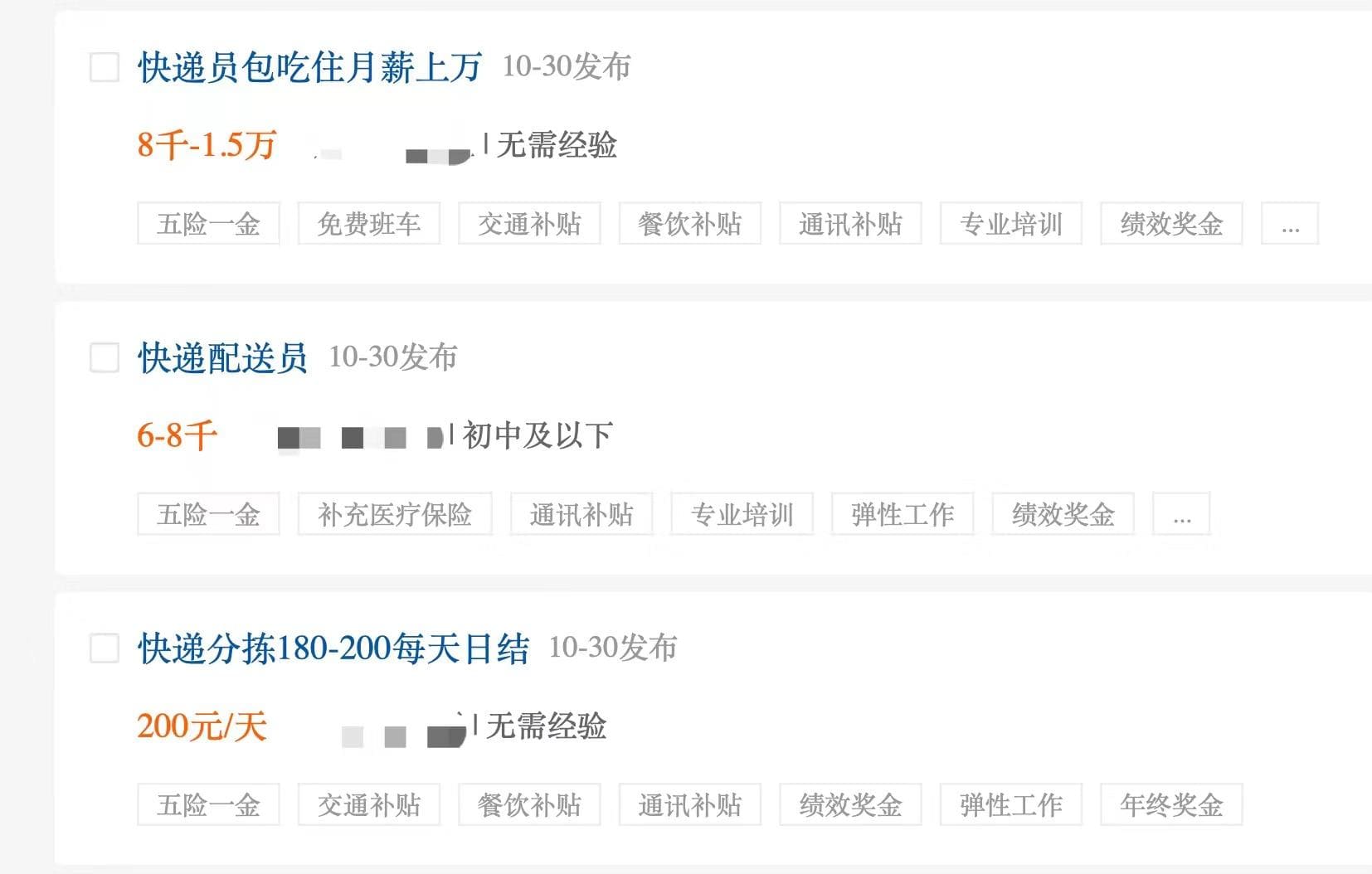 今晚,“尾款人”将会支付双十一第一阶段的尾款。这意味着,双十一的一大波快递即将发出。 快递公司近日开启“囤人”模式。据媒体报道,杭州某快递点发布招聘临时快递员的海报,称急招年龄在20岁到60岁之间的临时工,为应对即将到来的快递高峰。海报上显示,日薪最低300元,推荐他人上岗还可领取100个鸡蛋,“鼓励叔叔阿姨来应聘”。 “确实是缺临时快递员。”10月29日,时代周报记者在某一线城市走访多家快递网点了解情况,工作人员称双十一临近,确实需要临时快递员帮助做分拣、理货、装袋等工作,“加快派送速度”。但是对临时快递员不包吃不包住,每单提成1.5元或者更高,能力强的每天送300单以上,“月入过万,是有可能的”。 不仅是线下招募,时代周报记者在招聘平台上也看到不少快递员、分拣员的招聘帖子,“工资日结”“月薪过万”等成为招聘信息关键词。根据用人单位贴出的薪资信息,快递员基本月薪是6000元-8000元,最高可至15000元。“急聘”“无需经验”“就近安排”等字眼也能看出用人单位的紧迫。 近段时间,快递员招聘的帖子变多。 快递网点工作人员称,“招人难是快递行业常态”。她表示,由于快递员有时要拎着几十斤麻袋爬楼,需要能吃苦,体力强,“并不是每个人都能适应的”。 临时快递员派送费或更高 本轮快递高峰从11月初开始。中国快递协会此前对媒体表示,本轮快递高峰预计从2022年11月初至2023年春节前夕结束,共82天。据菜鸟方面透露的数据显示,预计今年双十一快递送货上门量将创下历史最高值。 为此,快递从业人员的缺口急需补上。那么,月薪万元招快递员的现象会否持续整个快递旺季? 记者走访多个快递网点了解到,2022年快递高峰将在11月1日之后开启,预计到11月20日左右结束。双十二的电商活动折扣力度相对较小,消费者购物量不如双十一。因此,快递网店工作人员认为,11月20日后的快件量对整体运力影响不大。 该网点工作人员称,的确存在缺人的情况。以该网点为例,目前共有十几人,由于双十一单量激增,需要招聘五到六名临时快递员,帮助快递员做分拣、理货等工作,以此加快派送速度。 但和毫无经验的新人相比,该网点工作人员称更倾向于有经验的快递员,“他们能更快、更好上手”。对方还称,招聘临时快递员确实是不限制性别和年龄,但考虑到消费者在双十一囤的货物可能为沐浴露、洗发水等重物,从体力来说男性搬运起来会更容易,女性多数是分配到分拣、理货等相对轻松的工作。 对于有报道称“杭州快递员日薪最低300元”,该网点工作人员称,“这个薪资是有可能的”。 她介绍,以她所在的网点是管住不管吃,正式快递员派送费为1.5元/单,每日至少需配送200单左右。“有经验的一天300单,闭着眼睛就送完了,下午五点就能下班”。此外,快递员上门取件的话,每单能挣6元左右。“本身而言,送快递月入过万,并不罕见。” 考虑到双十一快件量剧增,快递员需每天配送500-600件快递。以1.5元/单计算,一个成熟的快递员在20天内完成日均500单,派费就达到1.5万元。 该网点工作人员表示,为了加快派送速度,他们会以1.5元/单或更高的的派送费来招聘临时快递员。但是,网点不会为他们提供食宿,扣除这些生活费用后,到手的钱可能不如正式员工多。 “招人难是常态” 双十一前,快递公司“囤人”是常态。 时代周报记者在部分招聘平台上看到,10月下旬开始,急招快递员、分拣员等的招聘信息开始增多,招聘条件也不俗。“包吃住”“免费用车”等已经是基本条件,部分公司直接在岗位写明“只派送不装卸”“配车、就近分配”,有的甚至明确标注“只要求派送一个点位”。 待遇方面,快递员招聘的帖子基本以6000元为起步工资,有的上限甚至达到了1.5万元。而一些招募长期快递员的帖子还打出“享受工龄、防寒防暑补贴,年假年终奖”“购买社保五险和商业保险,有婚假、陪产假”“薪资可预支”等额外福利。 有贴出临时快递员招聘信息的快递网点对媒体表示,来打听的人多,很多人一听工作时长就放弃了。近些年双十一活动时间越来越长,配送高峰也延长了,只能靠高薪留人了。 优厚的待遇背后,是快递行业的招人难问题。根据58同城、赶集直招发布的2022年三季度人才流动趋势报告,三季度58同城、赶集平台上快递分拣员招聘需求同比上升69.27%。 前述快递网点工作人员认为,快递行业需要体力强,能吃苦的人,“并不是每个人都能适应的”。她举例称,该网点快递员需6点半起床干活,把快递分拣后会把一栋楼的快递都放在同一麻袋里。如果该楼没有电梯,快递员需要拎着几十斤重的麻袋从一楼爬到6楼,逐一派送到客户家门口,对体力要求较高。此外他们下班没有固定时间,“什么时候派送完,就什么时候下班”。 前段时间,她所在的网点受疫情影响,有员工在半个月内只工作了五天,重新回到工作岗位后,由于难以适应高强度的工作,最后也选择了辞职。 除此之外,快递员还需要承担时间和考核罚款的压力。由于快递车会在不同时间段多次送货,因此快递员需在某固定时间段前内送完快递并保证被签收。当发生快递延时和被投诉的状况时,快递员会被公司发罚款。如果发生丢件的情况,快递员需照价赔偿,“曾经有人也赔了客户好几千元的手机”,该工作人员称。