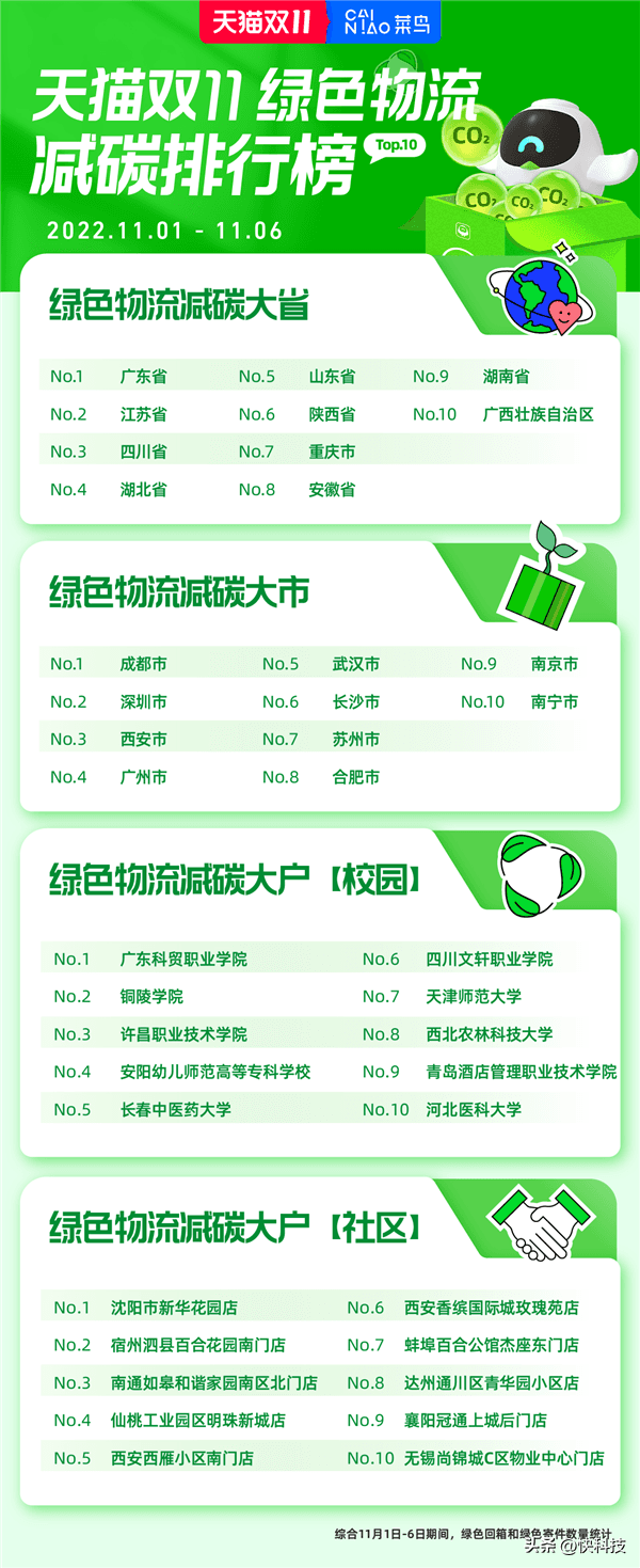 随着天猫双11第一波快递的陆续送达,快递包装回收再利用,也迎来了一波高潮。 11月9日,菜鸟公布了11月1日到6日全国各省市自治区、地级市、高校和社区菜鸟驿站回收包装减碳排行榜:广东继续领跑减碳大省排行榜,与江苏、四川、湖北和山东等10个省市自治区居于减碳排行榜前列。成都首次登顶,和深圳、西安、广州和武汉等10座地级市共同组成了减碳大市。 据悉,截止到7日,已经有接近百万人参与菜鸟快递包装回收活动,回收快递包装超过200万个,人均回箱超过2个。而在校园里,绿色回箱绿色寄件的热情更高,人均回箱数量达到3个。其中天津师范大学和西北农林科技大学,人均回箱数量甚至超过3个。 今年双11,为了继续鼓励大家参与绿色物流,菜鸟在全国13万家菜鸟驿站,启动“快递包装回收换蛋”,取快递时留下旧快递包装,就可兑换鸡蛋等礼物。本月1日启动后,3号兑换量攀升,已有约20万个鸡蛋被领走。留在驿站的旧快递包装,部分会被二次利用,免费用来寄件。 绿色回收换蛋、绿色寄件免包装费,拉动了各地参与绿色物流的热情。11月1日到6日期间,菜鸟驿站绿色回箱和绿色寄件的数量显示,广东、江苏、四川、湖北、山东、陕西、重庆、安徽、湖南和广西是这届双11的物流减碳大省(包含省、直辖市和自治区),其中广东持续领跑,四川和湖北是首次进入到TOP5。成都、深圳、西安、广州、武汉、长沙、苏州、合肥、南京和南宁则是物流减碳大市,成都也是首次登顶。 在高校里,大学生参与绿色回收减碳的热情也很高。铜陵学院、青岛酒店管理职业技术学院和天津师范大学已经连续两年成为高校届的减碳大户。在社区,沈阳新华花园菜鸟驿站回箱数量和绿色寄件数量位居全国第一,人均回箱超过10个。 沈阳新华花园菜鸟驿站已经设立了一年多,店面集快递暂存、洗衣、团购和复印等功能为一体,是居民们重要的生活服务帮手。驿站站长刘忠伟介绍,从去年开始,他就向居民推荐绿色回收,也在站内设立了醒目的宣传广告、口播顺口溜,逐步让居民开始主动回箱。 菜鸟绿色物流总经理王昊苏介绍,尽管天猫双11绿色物流刚刚过半,但从整体趋势来看,不管在大城市,还是在小地方;不管是名校,还是普通院校,全社会都在逐步接受旧快递包装绿色回收这样的理念,更加积极主动的参与绿色回收、绿色物流。 据悉,今年双11期间,菜鸟预计产生的各类绿色行为超20亿次,会是社会参与度史上最高的一次绿色物流双11,将有最广泛的消费者、商家、快递从业人员以及减碳平台的参与。