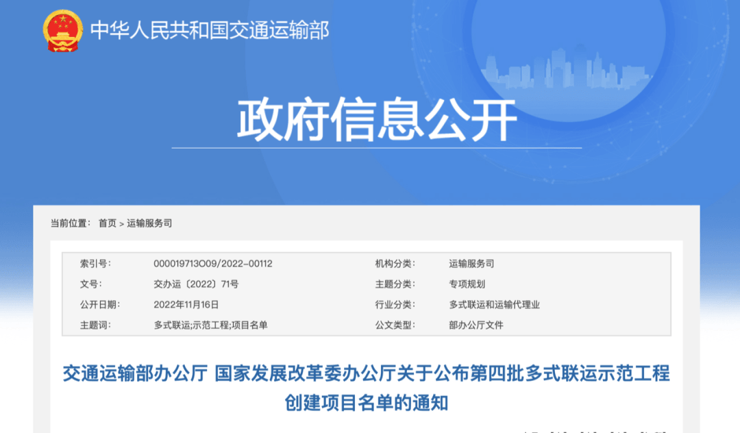 11月16日,交通运输部办公厅、国家发展改革委办公厅发布《关于公布第四批多式联运示范工程创建项目名单的通知》。《通知》要求,要加快推进示范工程建设有关工作。各有关省级交通运输、发展改革部门及中央企业要督促指导各有关企业认真落实实施方案,围绕基础设施一体衔接、多式联运组织模式创新、联运装备标准化专业化发展、运输服务规则衔接和“一单制”应用、跨运输方式信息互联共享等重点任务,加大改革创新力度,积极探索多式联运发展新举措、新经验,确保按期完成各项工作任务。 交通运输部办公厅 国家发展改革委办公厅关于公布第四批多式联运示范工程创建项目名单的通知 按照《交通运输部办公厅 国家发展改革委办公厅关于组织开展第四批多式联运示范工程申报工作的通知》(交办运〔2021〕58号)安排,经企业申请、形式审查、条件预审、实地审核、专家集中评审和公示,并经交通运输部和国家发展改革委研究同意,确定46个项目(附后)为第四批多式联运示范工程创建项目。现将有关事项通知如下: 一、细化完善示范工程实施方案 各有关省级交通运输、发展改革部门(或负责经济运行调节的部门,下同)及中央企业要加强对多式联运示范工程项目实施的支持和指导,督促有关企业认真贯彻落实两部委关于多式联运示范工程建设的有关要求,根据项目评选过程中专家提出的意见建议,进一步完善示范工程实施方案,明确细化目标任务,科学制定进度计划、考核指标、责任分工和保障措施。实施方案由省级交通运输、发展改革部门及中央企业审核同意后于2022年11月30日前报交通运输部、国家发展改革委备案(各两份,附电子版光盘)。 二、加快推进示范工程建设有关工作 各有关省级交通运输、发展改革部门及中央企业要切实加强对多式联运示范工程建设工作的组织领导,进一步完善多式联运示范工程建设组织架构和工作机制,强化统筹协调和业务指导,落实支持政策,确保示范工程建设取得实效。督促指导各有关企业认真落实实施方案,围绕基础设施一体衔接、多式联运组织模式创新、联运装备标准化专业化发展、运输服务规则衔接和“一单制”应用、跨运输方式信息互联共享等重点任务,加大改革创新力度,积极探索多式联运发展新举措、新经验,确保按期完成各项工作任务。 三、切实加大示范工程建设支持力度 各有关省级交通运输、发展改革部门及中央企业要积极创造条件,对纳入示范工程的相关项目,积极争取国家专项资金和本级人民政府、示范项目所在地人民政府及有关部门的政策支持,从土地、财税等方面给予支持和倾斜。交通运输部将结合国家综合货运枢纽补链强链工作,对有关示范工程项目予以支持。 四、认真做好示范工程建设绩效评估 各有关省级交通运输、发展改革部门及中央企业要加强对多式联运示范工程建设工作的动态监督和绩效评估,按照《交通运输部办公厅关于开展多式联运重点联系企业运行动态监测工作的通知》(交办运〔2017〕61号)要求,认真组织开展数据填报与复核、全面自查和集中督导工作,依托“多式联运重点联系企业动态信息报送系统”(网址:https://219.141.223.137:7001/),组织示范工程企业于每季度次月5日前完成当季度信息填报,以半年为周期,组织企业编写示范工程总结报告,于每年7月10日和次年1月10日前,报省级交通运输、发展改革部门及中央企业有关部门审核,省级交通运输、发展改革部门及中央企业有关部门结合集中督导情况进一步完善报告,并于每年7月25日和次年1月25日前报交通运输部和国家发展改革委。交通运输部、国家发展改革委将适时组织专家对示范工程建设情况进行重点抽查和检查评估。 为进一步加强沟通联络,请第四批多式联运示范工程项目所在地省级交通运输、发展改革部门及有关中央企业,于2022年11月30日前报送本单位处级人员一名、项目牵头企业主要负责人和具体负责人各一名,作为示范工程建设工作联系人。 交通运输部运输服务司联系人及电话:朱超,010-65293778、65293269(传真)。 国家发展改革委经济运行调节局联系人及电话:李聪,010-68505902、68505865(传真)。 交通运输部办公厅 国家发展改革委办公厅 2022年11月8日 (此件公开发布) 附件1 第四批多式联运示范工程创建项目名单 1.天津:荣程智运公铁水联运信息互联共享集成应用和“一单制”示范工程 牵头企业:荣程智运科技(天津)有限公司 联合企业:天津荣程联合钢铁集团有限公司、天津中联进出口贸易有限公司、天津南环铁路有限公司、天津港中企联合物流有限公司、天津天惠船务企业有限公司 2.河北:河北秦皇岛港服务“一带一路”建设、助力京津冀协同发展“两端跨境、三局衔接、四向联通”集装箱海铁联运示范工程 牵头企业:秦皇岛港股份有限公司 联合企业:秦皇岛港新港湾集装箱码头有限公司、泰通国际运输有限公司、秦皇岛秦仁海运有限公司、北京京铁经贸有限公司、内蒙古呼铁物流有限责任公司 3.河北:石家庄打造京津冀内陆物流中枢的“一核驱动、多点支撑、内外联动、点轴辐射”集装箱公铁海多式联运示范工程 牵头企业:亿博控股集团有限公司 联合企业:河北陆港建设集团有限公司、石家庄国际陆港物流有限公司、中铁国际多式联运有限公司、沧州港务集团有限公司、石家庄易路