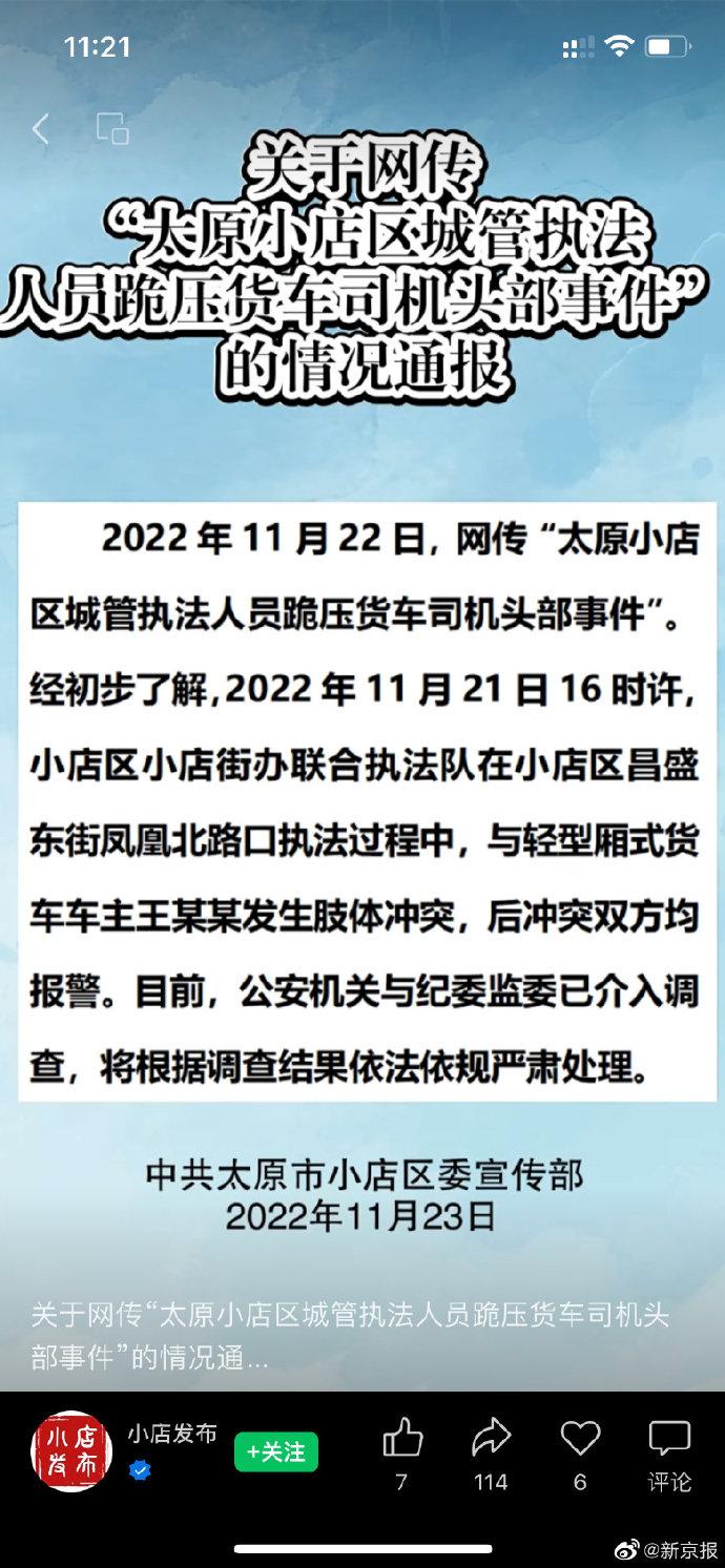 11月23日,山西省太原市小店区人民政府办公室发布关于网传“太原小店区城管执法人员跪压货车司机头部事件”的情况通报:2022年11月22日,网传“太原小店区城管执法人员跪压货车司机头部事件”。 经初步了解,2022年11月21日16时许,小店区小店街办联合执法队在小店区昌盛东街凤凰北路口执法过程中,与轻型厢式货车车主王某某发生肢体冲突,后冲突双方均报警。 目前,公安机关与纪委监委已介入调查,将根据调查结果依法依规严肃处理。