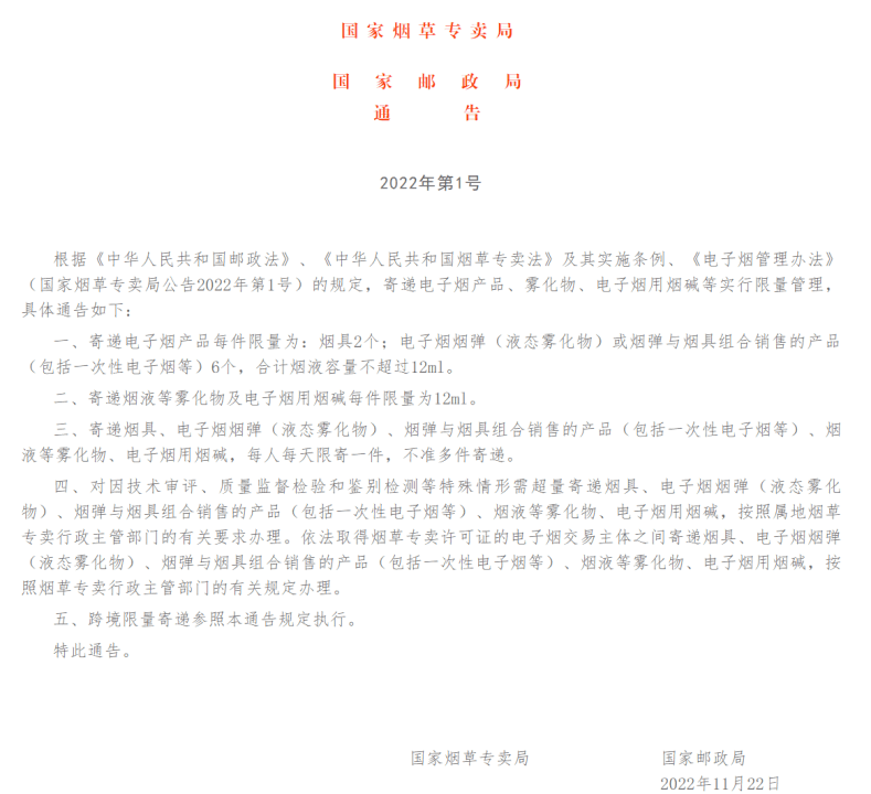 11月22日,国家烟草专卖局、国家邮政局发布《关于电子烟产品、雾化物、电子烟用烟碱等限量寄递的通告》(以下简称《通告》),对寄递电子烟产品、雾化物、电子烟用烟碱等实行限量管理。 根据《通告》,寄递电子烟产品每件限量为:烟具2个;电子烟烟弹(液态雾化物)或烟弹与烟具组合销售的产品(包括一次性电子烟等)6个,合计烟液容量不超过12ml。寄递烟液等雾化物及电子烟用烟碱每件限量为12ml。寄递烟具、电子烟烟弹(液态雾化物)、烟弹与烟具组合销售的产品(包括一次性电子烟等)、烟液等雾化物、电子烟用烟碱,每人每天限寄一件,不准多件寄递。 《通告》还要求,对因技术审评、质量监督检验和鉴别检测等特殊情形需超量寄递烟具、电子烟烟弹(液态雾化物)、烟弹与烟具组合销售的产品(包括一次性电子烟等)、烟液等雾化物、电子烟用烟碱,按照属地烟草专卖行政主管部门的有关要求办理。依法取得烟草专卖许可证的电子烟交易主体之间寄递烟具、电子烟烟弹(液态雾化物)、烟弹与烟具组合销售的产品(包括一次性电子烟等)、烟液等雾化物、电子烟用烟碱,按照烟草专卖行政主管部门的有关规定办理。跨境限量寄递参照本通告规定执行。 实际上,在通告征求意见期间,部分快递企业就开始落实相关要求。以顺丰为例,在多个省份上线电子烟寄送数量限制提醒。提示信息显示,“内地互寄”每人每天限寄1次电子烟设备(含烟弹)数量不超过6个,合计烟液容量(液态雾化物)不超过12ml。 主要品牌快递企业表示,将按照通告要求严格执行相关规定,加强网点培训,通过多种方式加强对客户、消费者和业务员的提醒。