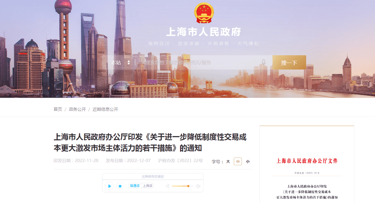 2022年12月7日,上海市人民政府办公厅印发《关于进一步降低制度性交易成本更大激发市场主体活力的若干措施》。 其中明确落实2022年第四季度收费公路货车通行费减免10%、政府定价港口货物港务费收费标准降低20%等政策。此外,文件明确研究完善载货汽车交通管理措施,优化城市物流配送车辆通行管理模式,进一步便利货车在城市道路通行。