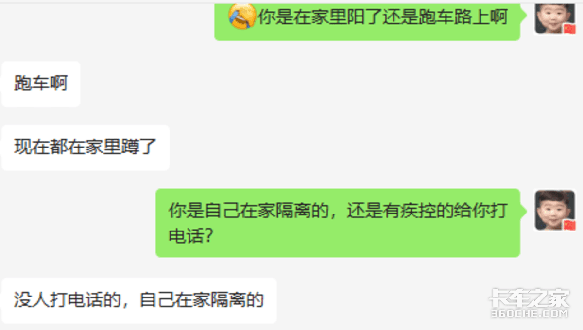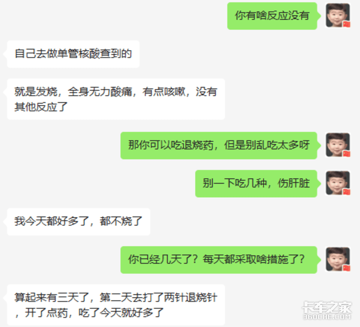最近可以看到,很多人分享感染新冠病毒后的感受和康复过程。前两天,一位卡友兄弟阳了,他通过小编和大家分享了一下他阳了以后的感受。 目前,这位大哥还自己在居家隔离中。 ● 送货路上阳了 算起来,陈师傅已经阳了3天了。目前,他已经退烧,人也好多了。 据陈师傅称,疫情逐步放开以后,他还是每天坚持做核酸的。前两天送货到绵阳的时候感觉到人不舒服,所以去做了单人单管核酸。 在结果没出来之前,陈师傅发烧了,并伴随着“全身无力酸痛,有点咳嗽,没有其他反应了”。 在这期间,因为持续发烧,陈师傅打了两针退烧针,还吃了退烧药。 ● 自觉居家隔离 阳了以后,陈师傅的码还是绿码,但他自觉做到居家隔离。隔离期间,和家人分开居住,避免家人感染。 截止到目前,陈师傅发烧的症状已经没了,但身体还有一些酸痛反应。虽然还没有转阴,但他表示:已经没有很大的反应了,主要就是要休息好。 在这里,我们也提醒所有的货车司乘人员,一旦阳了: 1、不要着急,保持心情愉快,多吃蔬菜水果。 2、多喝水。 另外,如果大家症状不是太重,优先选择互联网医院,把医院的资源留给有需要的老年人等。 但如下出现以下5种症状,必须联系医院。 第一种情况是出现呼吸困难或气短。 第二种情况是经过药物治疗以后,仍然持续发烧,超过38.5摄氏度,时间超过3天以上,就应该到医院。 第三种情况是原有基础病明显加重,比如高血压用药控制不住,糖尿病用药控制不住或者出现其他急危重症的风险的时候,一定要及时到医院救治。 第四种情况是儿童出现一些嗜睡、拒食、腹泻、呕吐等等情况,治疗以后不缓解,时间超过两天以上也要到医院救治。 第五就是孕产妇出现头痛头晕、心慌气短或者出现胎动异常等等情况,也要到医院进一步诊治。 在这里,还有友情提醒一下大家,阳了以后千万别乱吃药、也别过量吃药,尤其是各种退烧药等混合吃,一不小心会导致急性肝损伤。 此前,重症专家钟鸣表示:疫情走势预计1个月内达到感染峰值,但之后何时结束会比较复杂。由于跑车面临的感染风险较高,请各位货车司机朋友做好防护措施。 我们可以看到,12月12日,交通运输部关于印发《道路货运车辆、从业人员及场站新冠肺炎疫情防控工作指南(第七版)》的通知,取消了查验健康码、实施“落地检”有关要求,优化了从业人员核酸检测相关规定;同时,明确了货运场站作业人员“白名单”管理防疫措施,增加了建立一线人员预备队相关要求,确保突发情况下稳定运行。 其中,有关货运车辆司乘人员防疫指导如下: ● 编后语 疫情后时期,大家是自己健康的第一责任人。请外出戴好口罩,回家立即做好消毒。尽量不阳,或者争取晚点阳,不要赶上这一轮高峰阳了。 © 版权声明