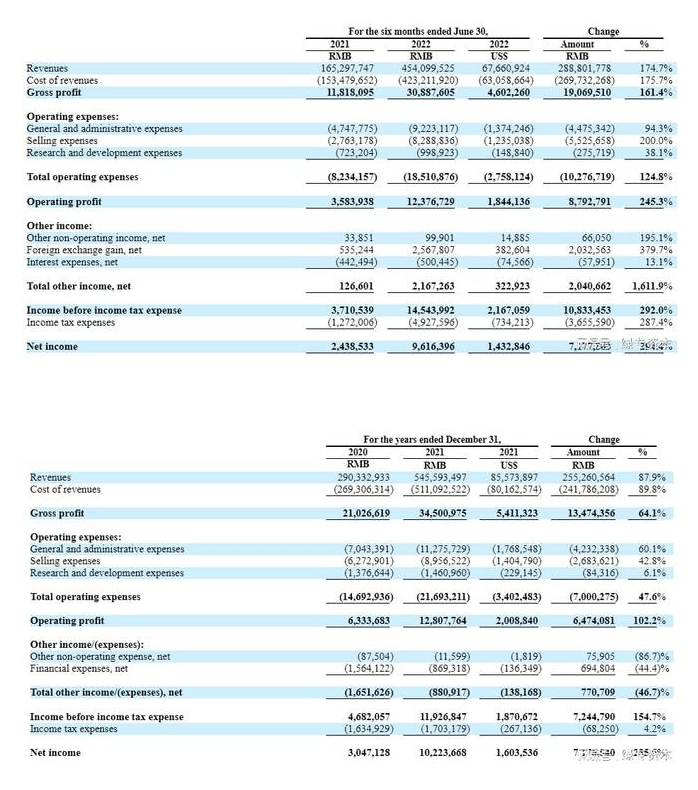 当地时间2月17日,深圳市佳裕达物流科技有限公司的控股公司Jayud Global Logistics Limited(以下简称:佳裕达)正式向美国证券交易委员会(SEC)递交IPO申请,拟以JYD为股票代码,申请在纳斯达克上市。披露显示,该公司最早于2022年9月21日向SEC递交秘密文件。 招股书中暂未披露发行量和发行价等信息。 佳裕达成立于2009年,总部位于深圳,是一家物流服务提供商,提供涵盖空运服务、海运服务、陆运、清关、物流配送、仓储、电子商务、跨境运输、物流软件系统开发等各个领域。根据官网介绍,该公司已与包括宁德时代、VIVO、OPPO、小米、联想、TCL、大族激光、中粮集团等在内的企业建立了战略合作关系。 财务数据 2020-2021年度,该公司的营收分别为2.9亿元、5.46亿元(8557万美元),这期间相应的净利润分别为305万元、1022万元(160万美元)。 2022年前六个月,佳裕达的营收为4.54亿元(6766万美元),上年同期为1.65亿元,这期间相应的净利润分别为962万元(143万美元)、244万元。 股权结构 IPO前,耿小刚持股32.05%,Dun Zhao持股2.5%,Jianhong Huang持股18%。贾晓华持股8.6%,Yu Yi持股5%。