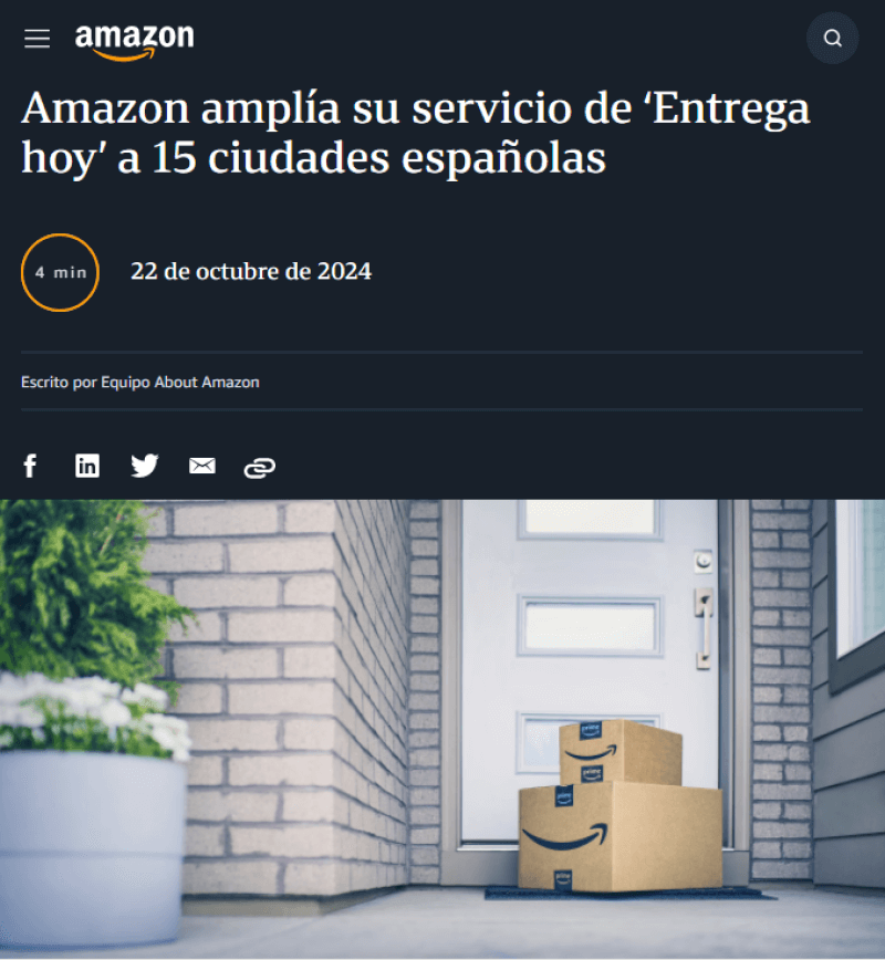 亚马逊宣布其当日送达服务已在西班牙15个城市和法国4个城市正式推出。现在,西班牙数百万Amazon Prime客户均可享受29欧元或以上合格订单的当日送达服务,无需额外费用,从点击下单到送货上门只需几个小时。2024年到目前为止,与上一年相比,亚马逊在西班牙的当日送达订单数量增加了三分之一。图源:Amazon Newsroom根据Ipso...