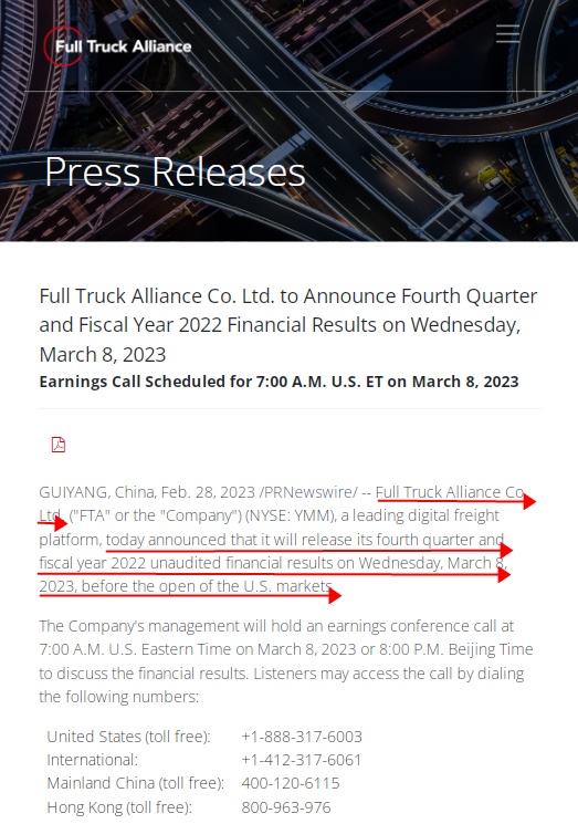 3月1日消息,满帮集团日前宣布将于2023年3月8日星期三美股开盘前,发布其2022年第四季度和2022财年未经审计的财务业绩。财报发布后,公司管理层将于美国东部时间2023年3月8日上午7:00(北京时间晚上8:00)召开财报电话会议,讨论财务业绩。据了解,2022年11月,满帮集团公布了截至2022年9月30日的第三季度未经审计的财务业绩...