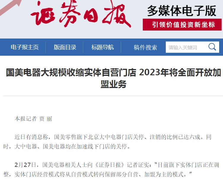2月28日消息,近日有消息称,国美零售旗下北京大中电器门店关停、注销的比例已达六成。同时,大中电器、国美电器均在加速线下门店的关停。对此,国美电器相关人士向《证券日报》记者证实:“目前旗下实体门店正在调整,实体门店经营模式将从自营模式转向保留部分自营、加盟为主的模式。”截自证券日报网在2月10日国美新模式...