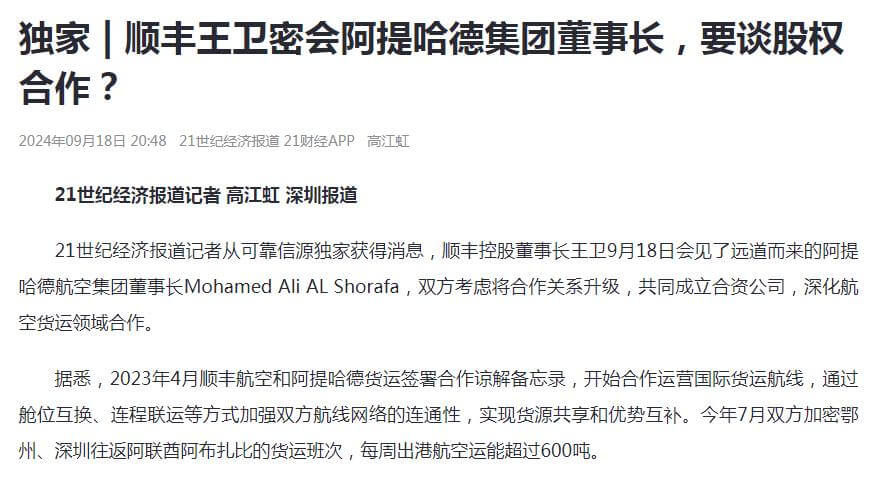 据《21世纪经济报道》,顺丰控股董事长王卫于日前会见了阿提哈德航空集团董事长 Mohamed Ali AL Shorafa。双方对签署新的合作谅解备忘录进行了深入探讨,旨在升级合作关系,并正式明确共同成立合资企业的计划,以深化航空货运领域的合作。这份备忘录标志着顺丰航空与阿提哈德货运正式开启全面战略合作,双方将在飞机运力投放...