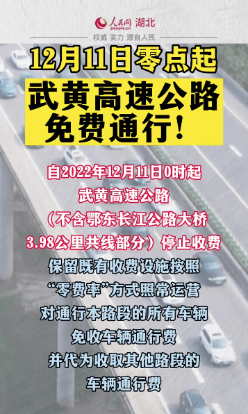 12月8日从湖北省交通运输厅网站获悉,武黄高速将于12月11日零点起免费通行,这也是全国第4条、湖北省首条收费期满免费通行的高速公路。根据《收费公路管理条例》有关规定,自2022年12月11日0时起,武黄高速公路(不含鄂东长江公路大桥3.98公里共线部分)停止收费,保留既有收费设施按照“零费率”方式照常运营,对通行本路段...