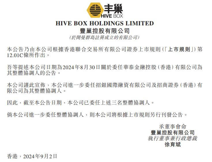 丰巢于近日发布公告宣称,公司进一步任命招银国际融资有限公司以及招商证券(香港)有限公司担任其整体协调人。在此之前,丰巢任命华泰金融控股(香港)有限公司为其整体协调人。截至公告发布之日,该公司已任命上述三位整体协调人。图源:港交所据悉,2024年8月30日,丰巢正式向香港联合交易所递交招股说明书,拟于主板挂牌...