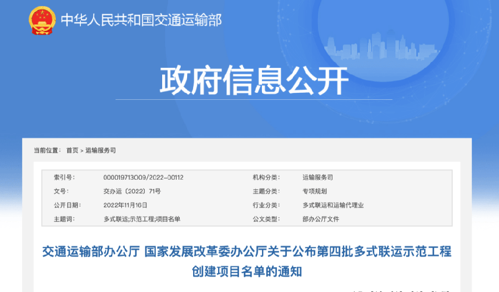 11月16日,交通运输部办公厅、国家发展改革委办公厅发布《关于公布第四批多式联运示范工程创建项目名单的通知》。《通知》要求,要加快推进示范工程建设有关工作。各有关省级交通运输、发展改革部门及中央企业要督促指导各有关企业认真落实实施方案,围绕基础设施一体衔接、多式联运组织模式创新、联运装备标准化专业化发展...