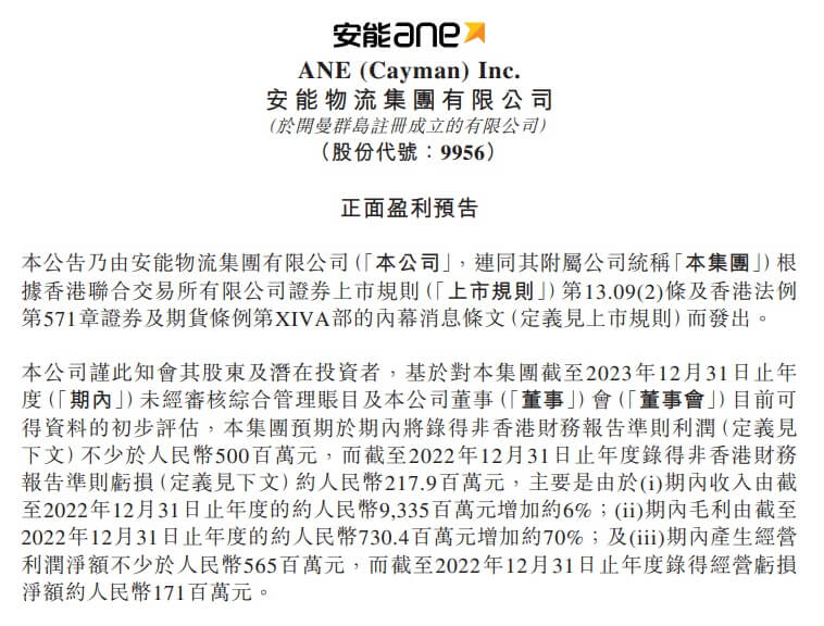 安能物流在港交所公告,基于对集团截至2023年12月31日止年度未经审核综合管理账目及公司董事目前可得资料的初步评估,集团预期于期内将录得非香港财务报告准则利润不少于人民币5亿元。而截至2022年12月31日止年度录得非香港财务报告准则亏损约2.18亿元,主要是由于期内收入由截至2022年12月31日止年度的约93.35亿元增加约6%...