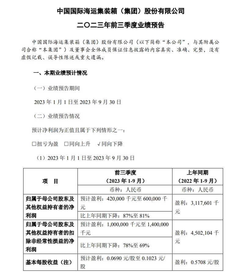 CIMC发布了2023年前三季度的业绩预测。预计前三季度归母净利润4.2亿-6.0亿元,同比下降81%-87%。第三季度预盈2144.4万元至2.01亿元,同比下滑65%至96%。针对2023年1-9月合并业绩低于上年同期预期的问题,CIMC表示,目前,全球集装箱运输行业市场需求和货运量已从低位企稳,集团今年第三季度集装箱制造业务较第二季度进一步回...