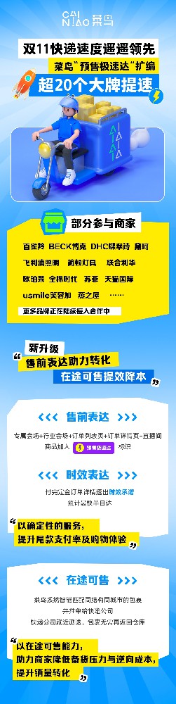 菜鸟今年双十一将升级产品“预售极速达”,通过售前表情、时效表情、途中特卖、短链配送等创新举措,进一步帮助商家提升销量、降低成本。为了打造快捷的配送体验,截至目前,联合利华、欧珀莱、夸迪、百雀羚、usmile、苏菲、全棉时代、燕之屋等20多个知名品牌已确认在今年双十一使用菜鸟“预售极速达”,其他众多品牌也在陆...