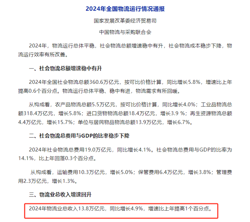国物流与采购联合会发布的数据显示,2024年中国物流市场规模保持平稳增长,全年物流业总收入13.8万亿元(人民币,下同),同比增长4.9%。截图图源:中物联物流枢纽与园区分会公众号物流与产业深度融合,综合服务竞争力持续提升,2024年头部物流企业物流业务收入规模超过2万亿,占全行业比重超过16%。从行业主体看,据第五次...