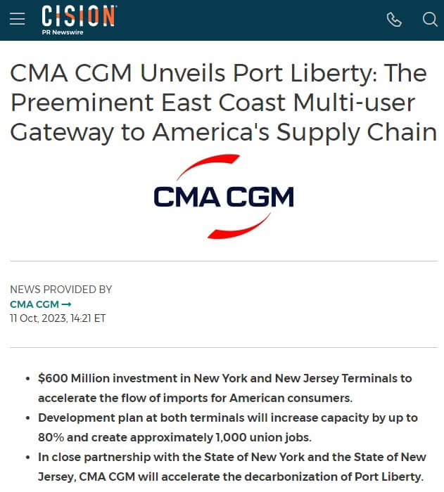 达飞在纽约曼哈顿的新闻发布会上推出了一个名为“PortLiberty”的新品牌,并将早前收购的纽约和新泽西两个码头更名。最近,达飞完成了对两个集装箱码头的收购,纽约港GCT纽约和新泽西港GCT贝永。据报道,达飞从GCT购买的两个集装箱码头价值可能超过30亿美元。现在,CMA推出新品牌后,GCT纽约和GCT贝永分别更名为Port&...