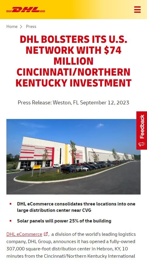 敦豪集团(DHLGroup)最近在美国投资建设了其最大的电子商务设施,投资额为7400万美元。此前,敦豪在美国投资了快递和供应链业务。在肯塔基州,敦豪电子商务(DHLeCommerce)在希伯伦开设了一个配送中心,距离辛辛那提/北肯塔基国际机场(CVG)只有10分钟的路程,辛辛那提/北肯塔基国际机场是敦豪在北美的航空枢纽。同...
