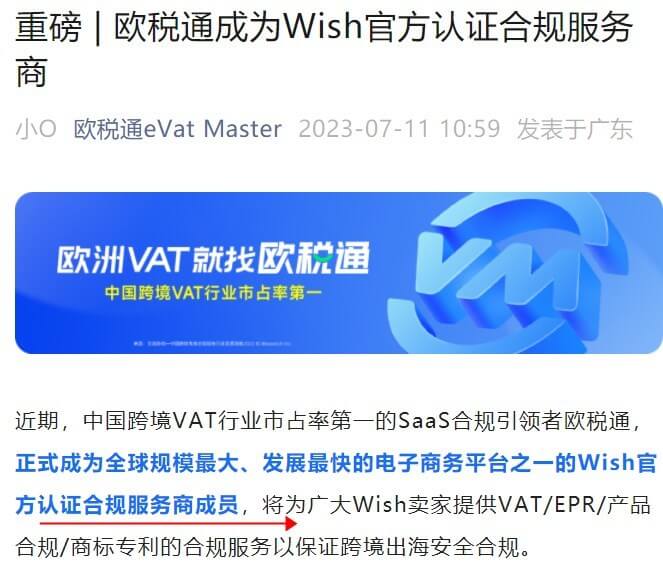 欧税通近期正式成为全球规模最大、发展最快的电子商务平台之一的Wish官方认证合规服务商成员,将为广大Wish卖家提供VAT/EPR/产品合规/商标专利的合规服务。WIsh官方按照严格的审核标准搭建了第三方服务商合作网络。经过层层筛选,严苛的条件审核(包括公司资质、业务能力、技术创新等),欧税通获得了Wish官方认可,成为Wis...