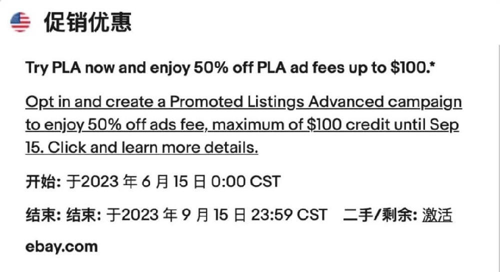 eBay发布通知称,高级促销刊登广告(PLA)促销活动正在进行中,使用高级促销刊登广告工具,立享高级促销刊登广告费用50%折扣,最高可省100美元/英镑/欧元/澳元。eBay高级促销刊登广告(PLA)促销活动时间截至2023年9月15日23时59分。本活动仅针对在卖家中心(Seller Hub)收到活动邀请的eBay帐号和站点。受邀eBay帐号需在卖...