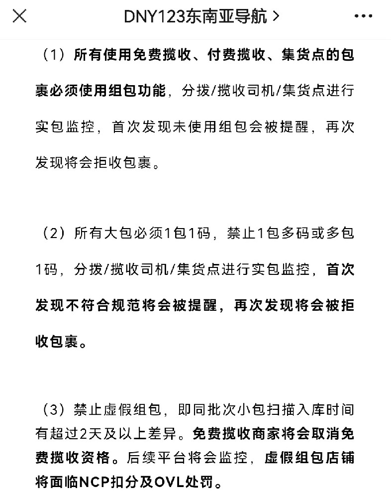 Lazada近日发布通知,提醒卖家注意规范组包操作及交接标准,不规范包裹二次发现将被拒收。具体来说,所有使用免费揽收、付费揽收、集货点的包裹必须使用组包功能,分拨/揽收司机/集货点进行实包监控,首次发现未使用组包会被提醒,再次发现将会拒收包裹。所有大包必须1包1码,禁止1包多码或多包1码,分拨/揽收司机/集货点进...