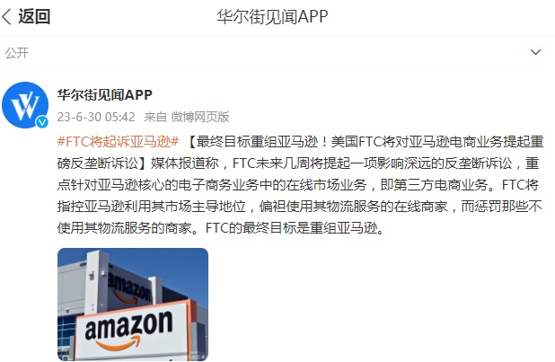 据报道,FTC未来几周将提起一项影响深远的反垄断诉讼,重点针对亚马逊核心的电子商务业务中的在线市场业务,即第三方电商业务。FTC将指控亚马逊利用其市场主导地位,偏袒使用其物流服务的在线商家,而惩罚那些不使用其物流服务的商家。FTC的最终目标是重组亚马逊。其中两名知情人表示,在过去的几个月里,FTC调查人员一直在...