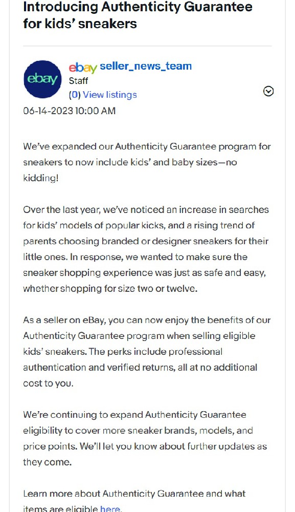 eBay美国站近日宣布,为了增强消费者的购买信心,推出儿童运动鞋“正品认证”(Authenticity Guarantee)服务。过去一年,eBay平台注意到用户对儿童流行运动鞋的搜索量增加,越来越多的服务会为儿童选择品牌或设计师运动鞋。如果卖家在eBay上销售合格的儿童运动鞋,那么卖家将享受正品认证服务提供的福利。包括专业认证和验证...