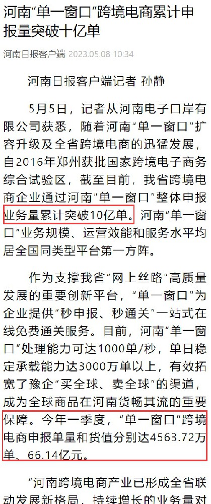 有媒体从河南电子口岸有限公司获悉,截至目前,河南跨境电商企业通过河南“单一窗口”整体申报业务量累计突破10亿单。河南“单一窗口”业务规模、运营效能和服务水平均居全国同类型平台第一方阵。据了解,河南“单一窗口”为企业提供“秒申报、秒通关”一站式在线免费通关服务。目前,河南“单一窗口”处理能力可达1000单/秒...