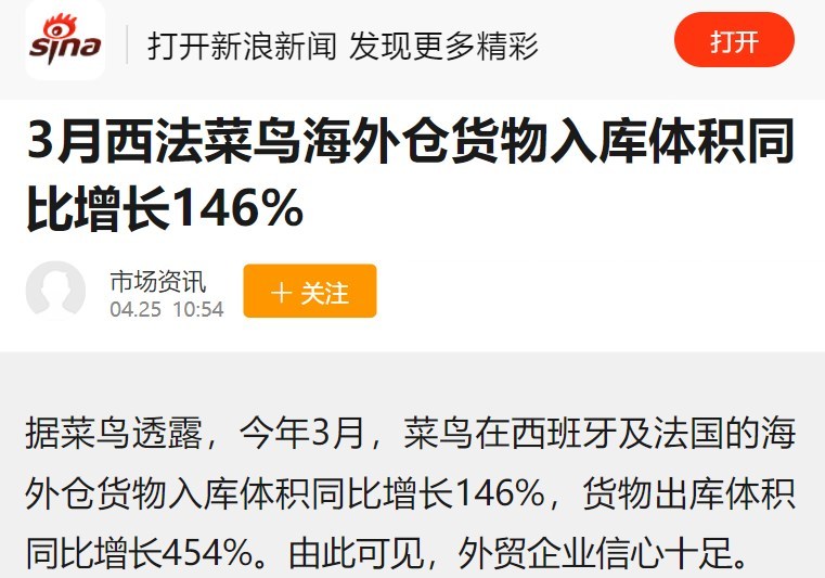 媒体从菜鸟获悉,今年3月,菜鸟在西班牙和法国的海外仓入库量同比增长146%,货物出库量同比增长454%。苏州一家玩具商家的负责人梅成仁说,“3月份,我们在全球速卖通等平台的销售额比2月份增长了30%。好在我们已经提前在西班牙和美国的菜鸟海外仓备货,通过海外仓发货。我们在欧洲的客户最快2天就能收到。”据菜鸟海外仓负责...