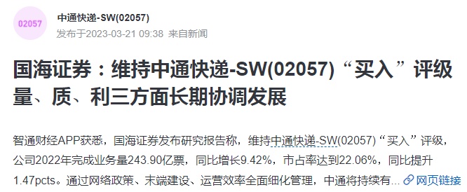 3月21日消息,国海证券发布研究报告称,维持中通快递-SW“买入”评级,公司2022年完成业务量243.90亿票,同比增长9.42%,市占率达到22.06%,同比提升1.47pcts。通过网络政策、末端建设、运营效率全面细化管理,中通将持续有效平衡把握“量”、“质”、“利”三方面长期协调发展,在业务发展的同时也为投资人创造更大的价值,...