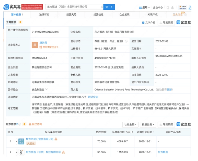 企查查APP显示,近日,东方甄选(河南)食品科技有限公司成立,法定代表人为康叶茂,注册资本5842.21万元人民币,经营范围包含:食品生产、销售;工程和技术研究和试验发展;食品销售(仅销售预包装食品);保健食品(预包装)销售等。企查查股权穿透显示,该公司由焦作市成汇食品有限公司、东方优选(北京)科技有限公司共...
