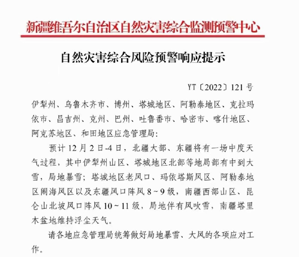 12月1日,新疆发布自然灾害综合风险预警响应提示:预计12月2日-4 日,北疆大部、东疆将有一场中度天气过程,其中伊犁州山区、塔城地区北部等地局部有中到大雪,局地暴雪:塔城地区老风口、玛依塔斯风区、阿勒泰地区闹海风区以及东疆风口阵风8~9级,南疆西部山区、昆仑山北坡风口阵风 10-11级,局地伴有风吹雪,南疆塔里木盆地...